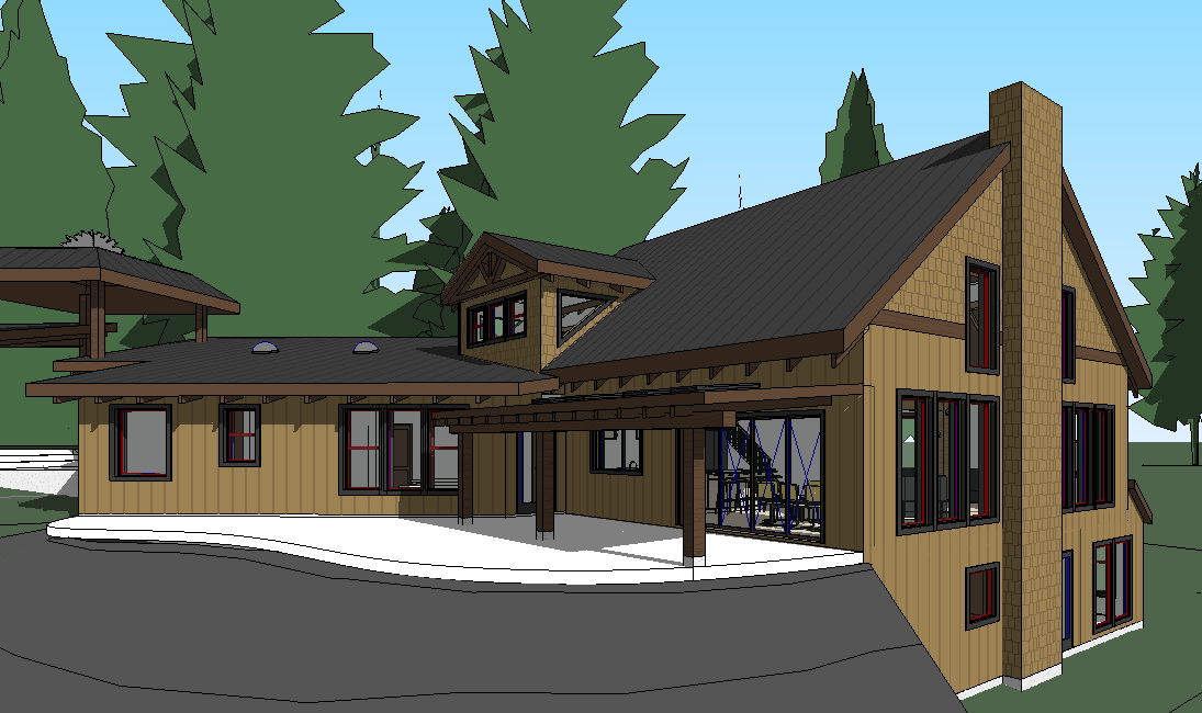 add natural lighting make look realistic add landscaping and a forest background add an ocean reflection in the windows