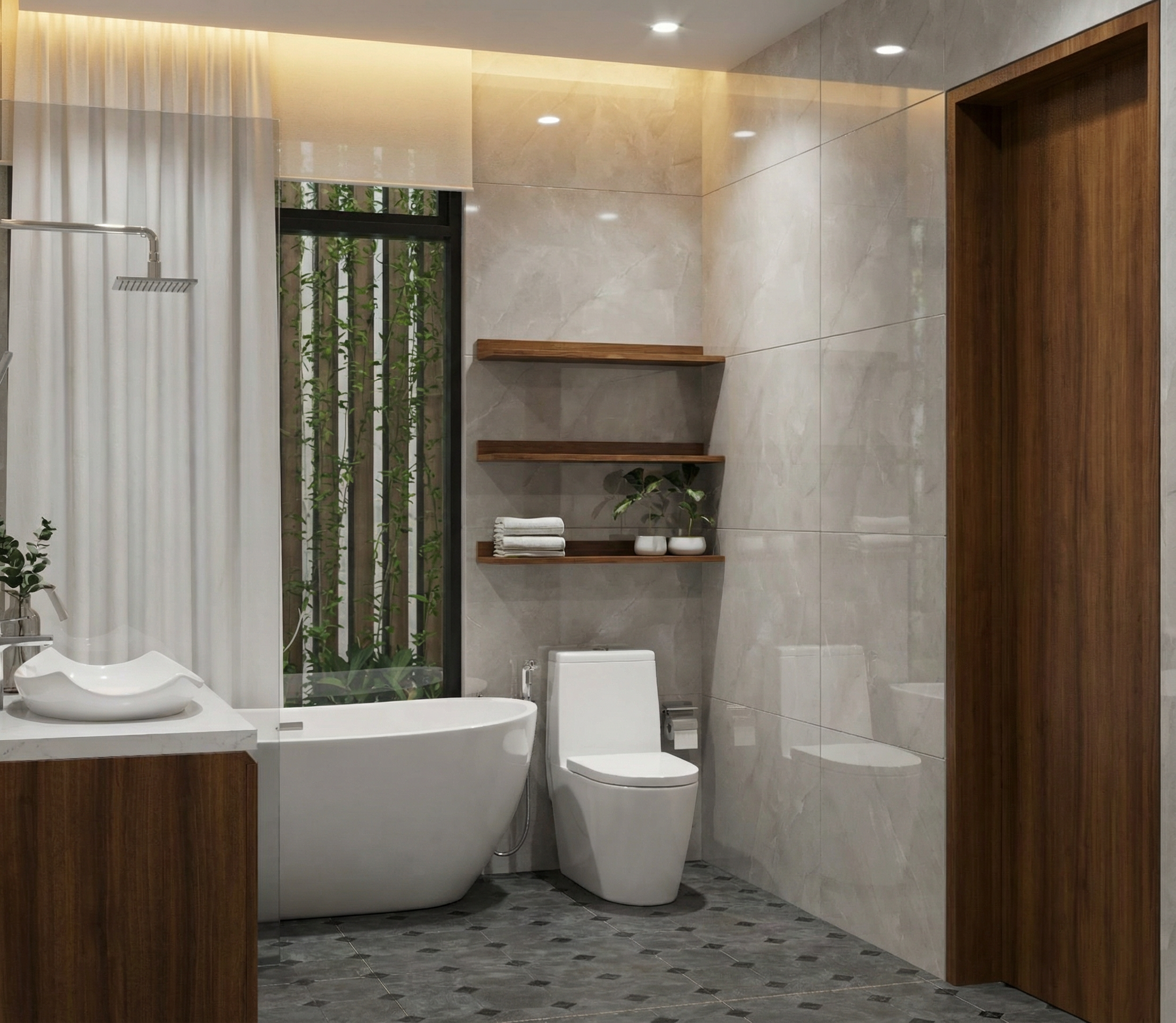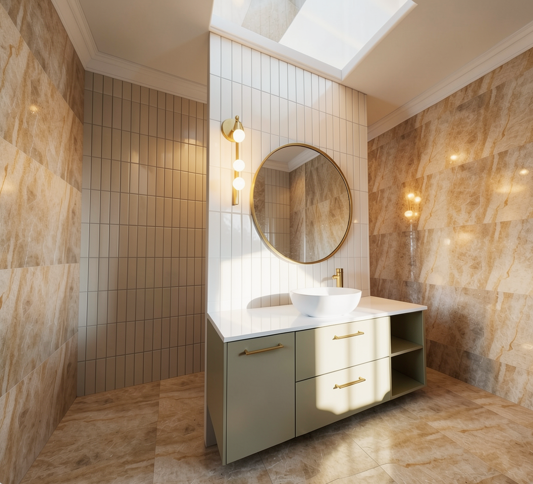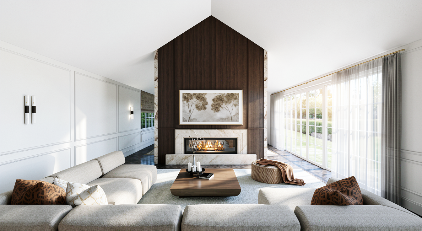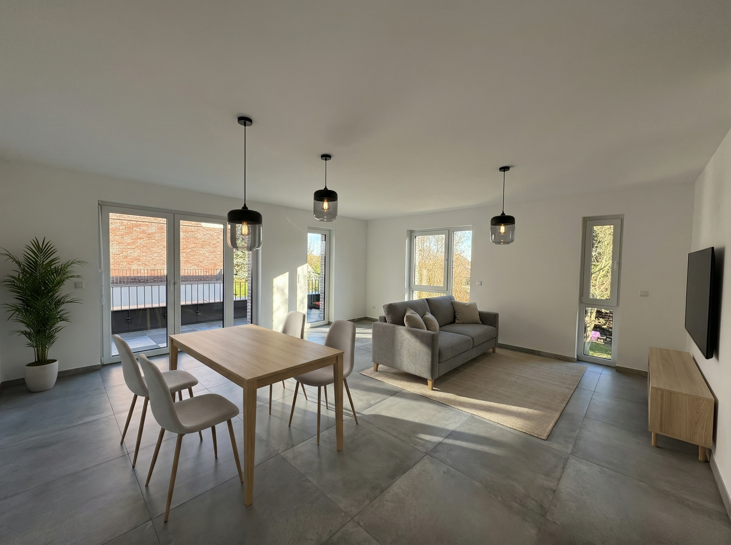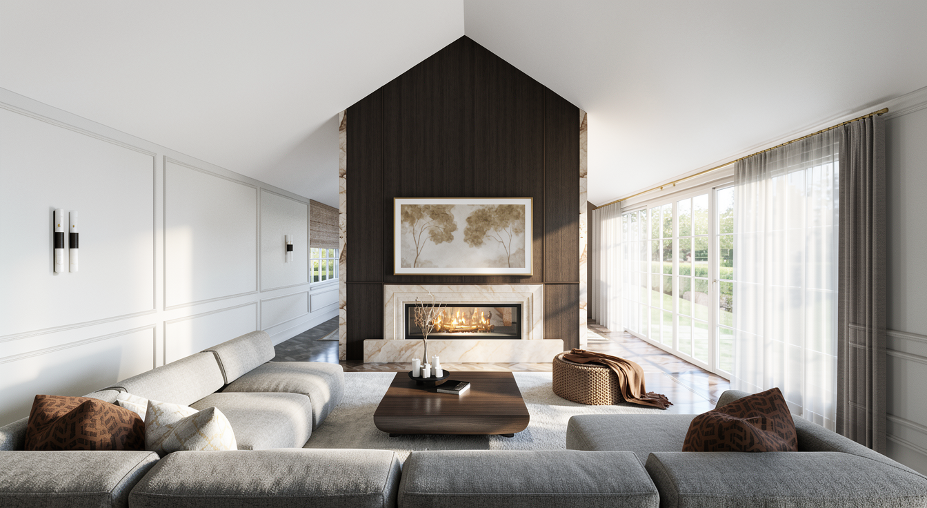create a photorealistic architectural interior visualization while strictly preserving the original geometry proportions and camera angle style direction natural colors and realistic textures high material fidelity and craftsmanship accuracy no exaggerated contrast no showroom aesthetics no dramatic lighting calm authentic residential atmosphere materials floor tobacco brown oak parquet natural matte oil finish fine authentic grain variation sideboard minimalist rift cut oak veneer vertical grain orientation as in the image warm natural oak tone ultra matte finish precise joinery built in wardrobes cool white super matte lacquer handleless smooth architectural finish sliding door left ral 9010 matte lacquer walls ral 9010 white plaster with subtle mineral texture lighting large window front on the left with soft lateral daylight neutral daylight balance soft shadows realistic light falloff no dramatic highlights or artificial glow styling very restrained architectural decoration only ceramic vase linen object small book stack subtle plant no visual clutter no staged showroom styling rendering constraints maximum realism in wood lacquer and plaster surfaces true to life color calibration maintain a calm high end residential architectural visualization look