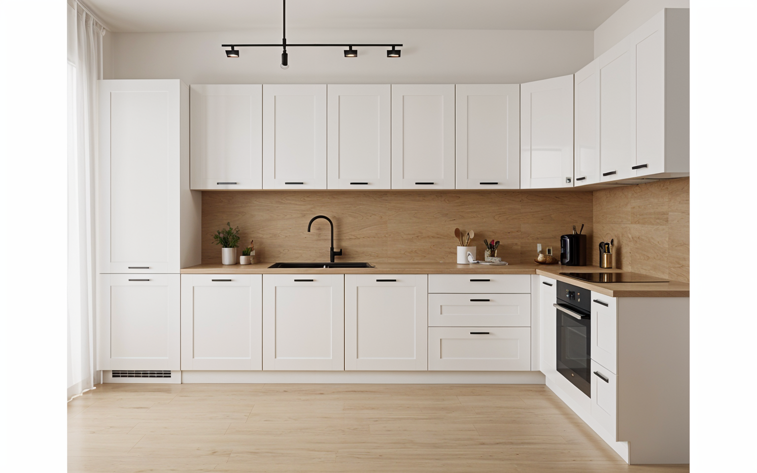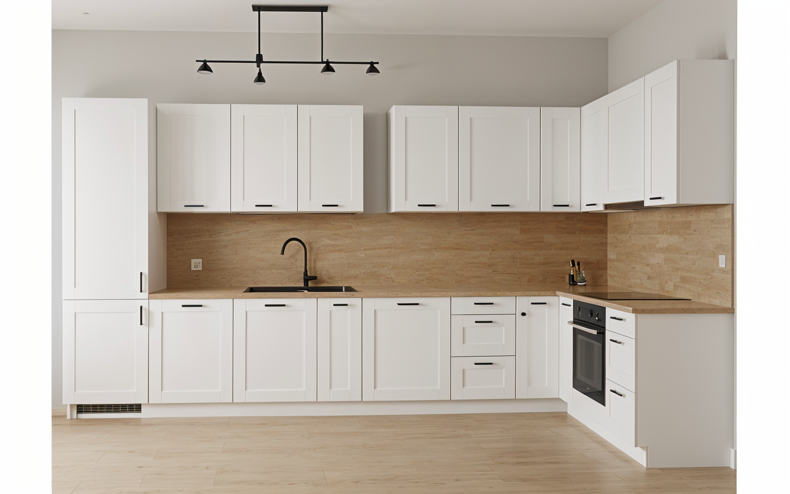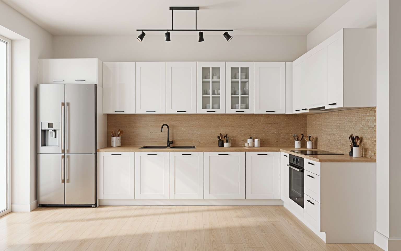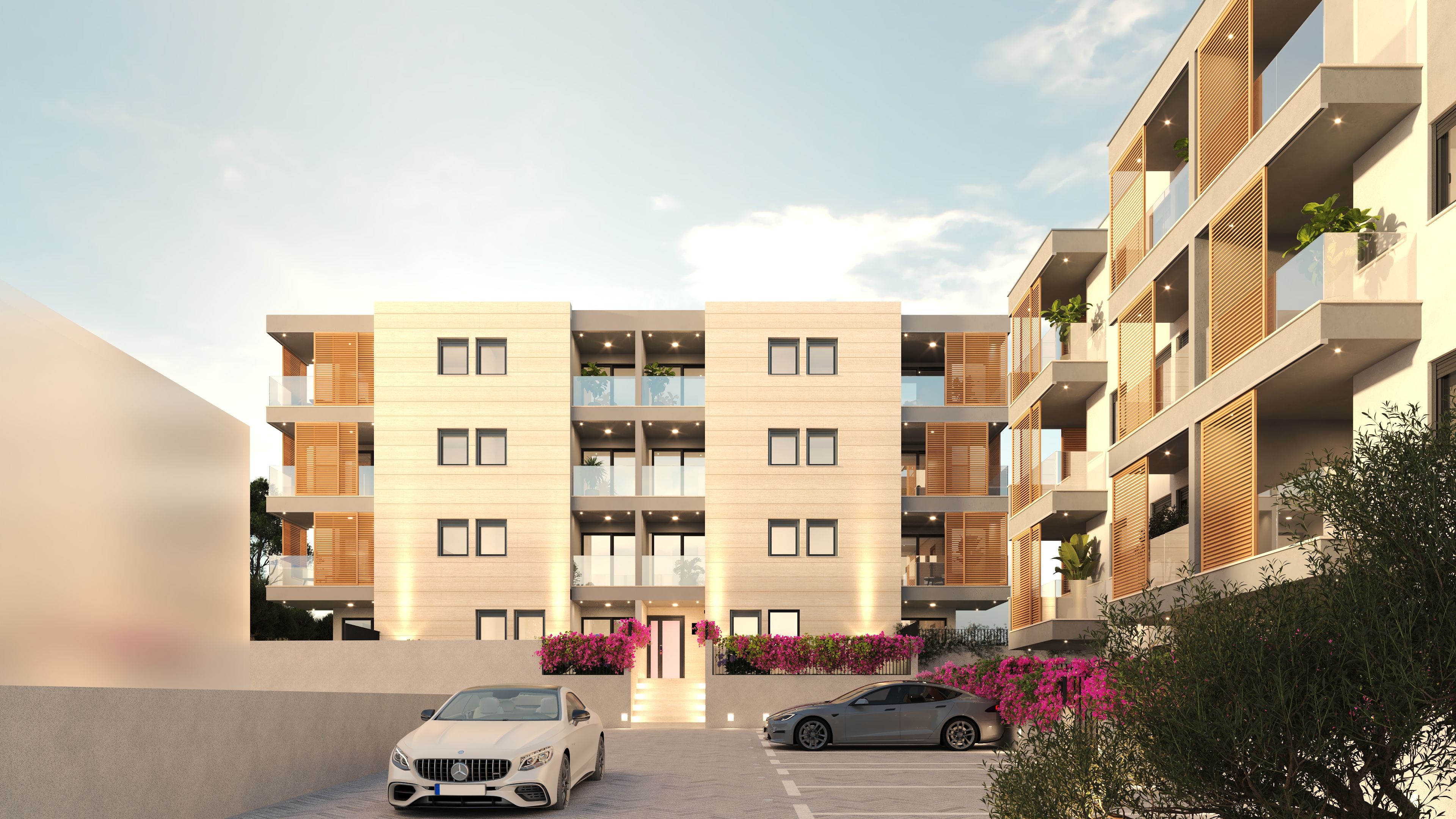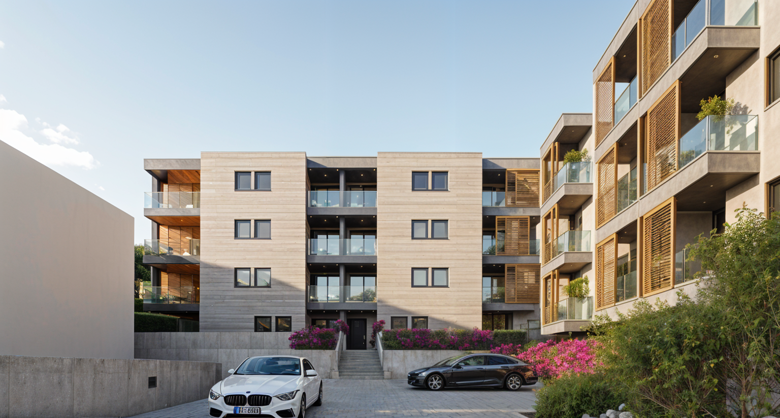 render a modern residential building with clean minimalist architecture the building features light beige stone walls with light gray trims accented by warm natural wood paneling on the balconies glass balustrades on each balcony reflect the sky s azure blue surround the building with vibrant green trees and bushes and flourishing magenta bougainvillea the sky is a crisp blue with soft white clouds to create a serene peaceful atmosphere the overall mood is bright and inviting with gentle sunlight highlighting the textures and colors