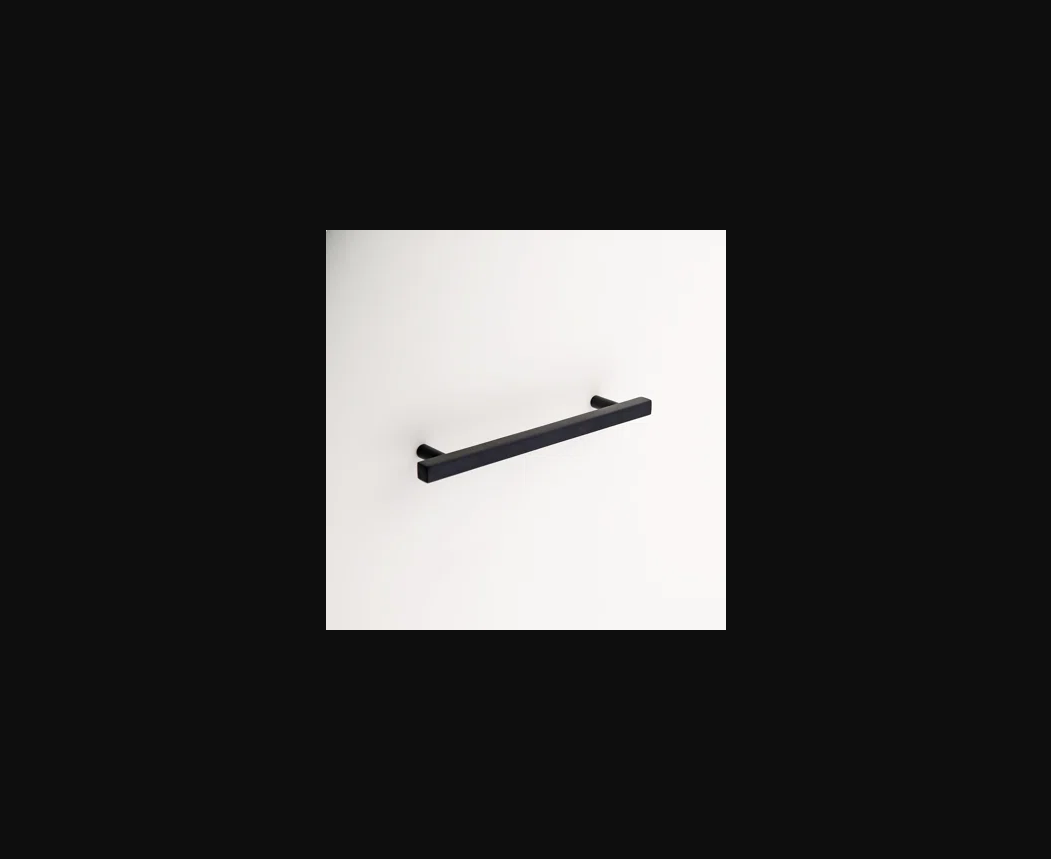modern kitchen with white shaker cabinets and matte black hardware show this matte black bar pull vent cover installed on a cabinet door navy blue lower cabinets with white upper cabinets quartz countertops with subtle veining warm wood accents professional interior design photography high end transitional kitchen