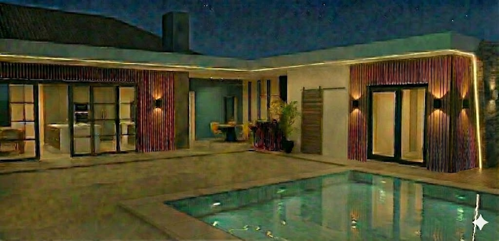 modern minimalist house with a relaxing atmosphere featuring a spacious patio with light gray concrete tiles the pool water is a clear inviting blue reflecting the bright sky the building has a mix of sleek materials vertical wooden slats in warm brown complemented by a bold stone accent wall in earth tones the roof is covered in vibrant orange red tiles adding a pop of color large glass doors lead inside framed by black accents there s a cozy outdoor dining area with a round table and yellow chairs against a deep teal wall lush green plants add a touch of nature to the modern setting