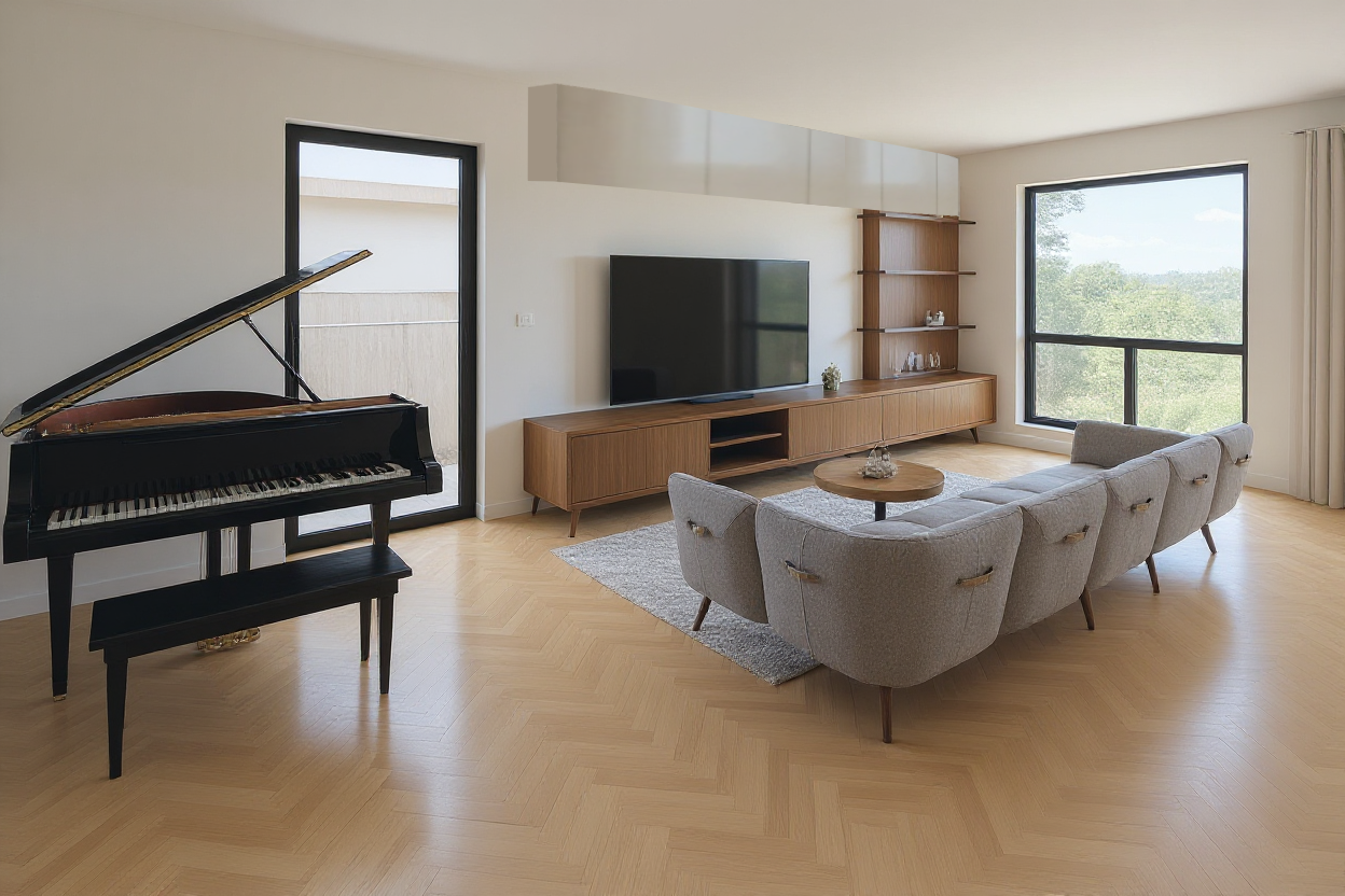 remove bottom window hand side use same color tone to render this one lighter interior space long linear wood panel floor same as previous rendering litter wood floor interior space lighter add a chandelier light above dining table tall ceiling lower the light add 3 pendant light top of the island bigger pendant light see blue line for upper cabinet red light for dining table foots euphonize this drawing make upper cabinet has swing doors