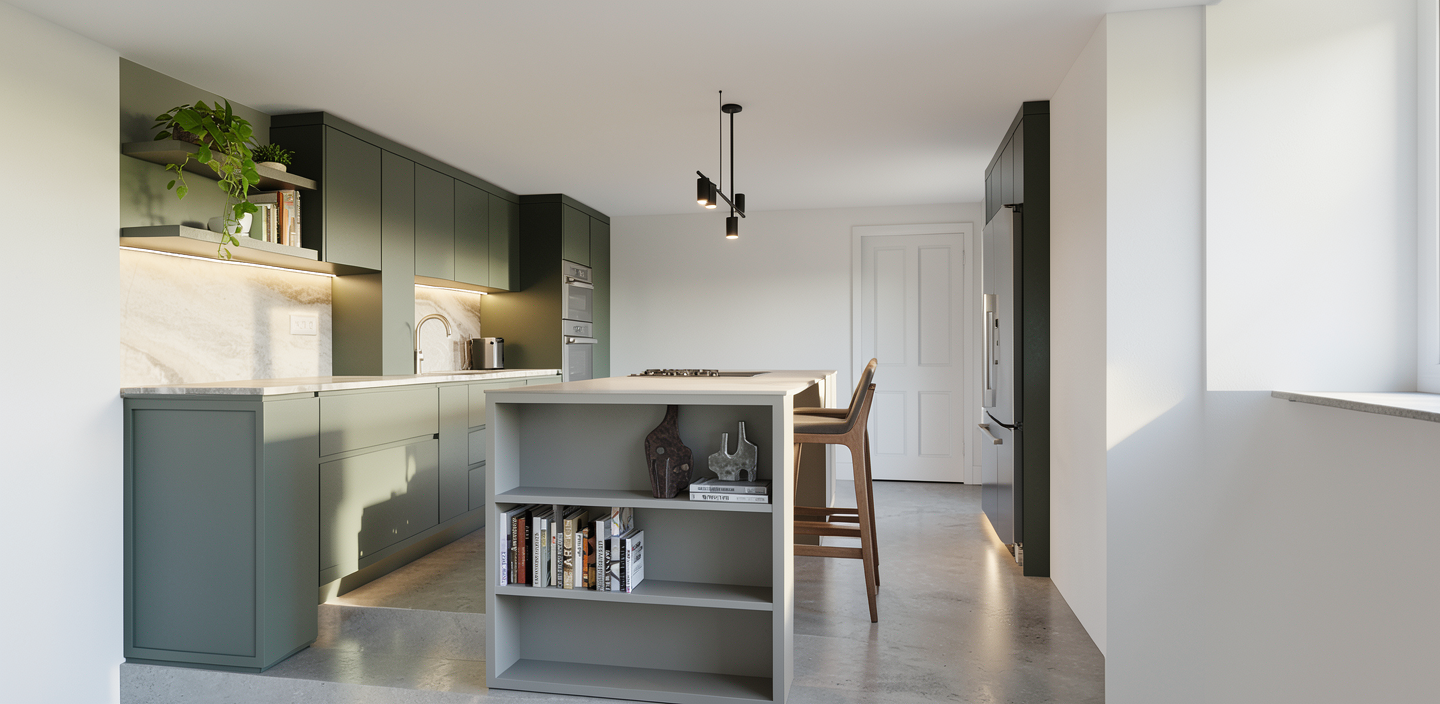 create a modern sleek kitchen interior include white upper cabinets with black handles the base cabinets are a dark grey matte tfl the kitchen island should be spacious with a concrete countertop use a stainless steel range with a sleek stainless steel vent hood add a large stainless steel refrigerator incorporate a stainless steel sink under a window with a view of a lush green garden the flooring is concrete creating a warm ambiance ensure even soft lighting from recessed ceiling lights to enhance the contemporary and inviting atmosphere