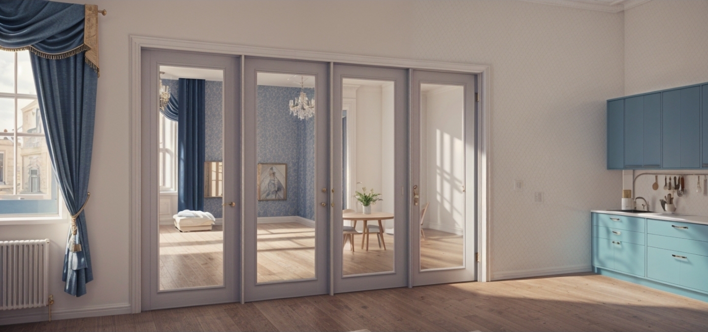 make these doors be half open in a bifold style with beautiful modern decor and furniture