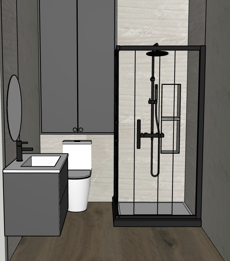 afternoon light coming from ceiling window light above led light on in niches in shower and behind the mirror a single flush ceiling spot light above the shower area and above the toilet area