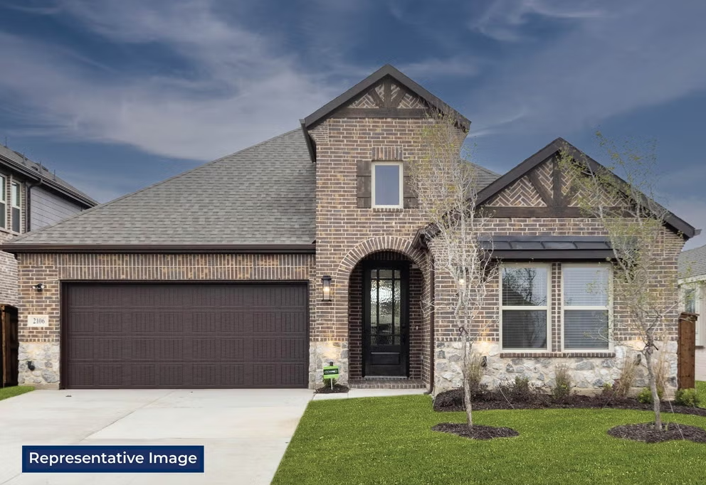 exterior shot create a photo realistic 3d rendering the brick is reddish brown the stone is austin white limestone landscaping should resemble plants found in north text i need the image to be 16 9 aspect ratio fix the windows you have a window in the metal roof accent architecture