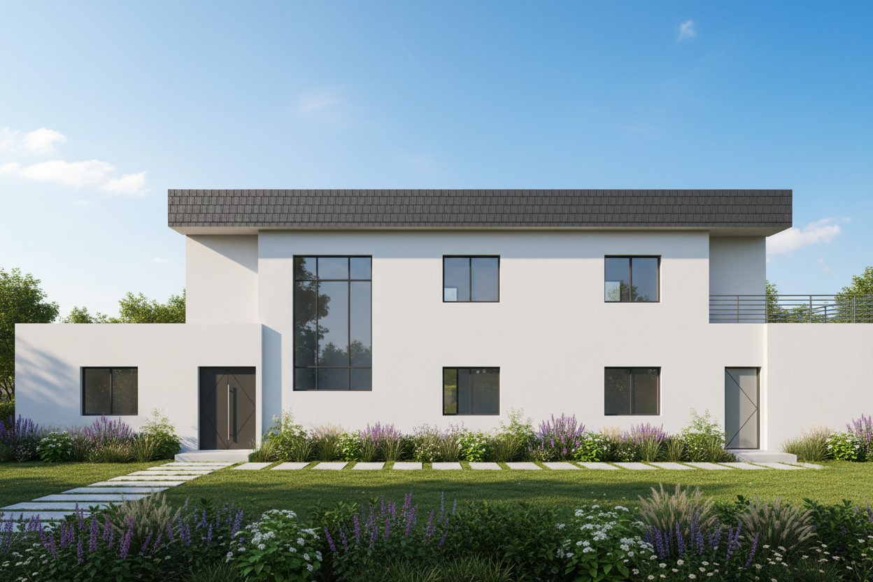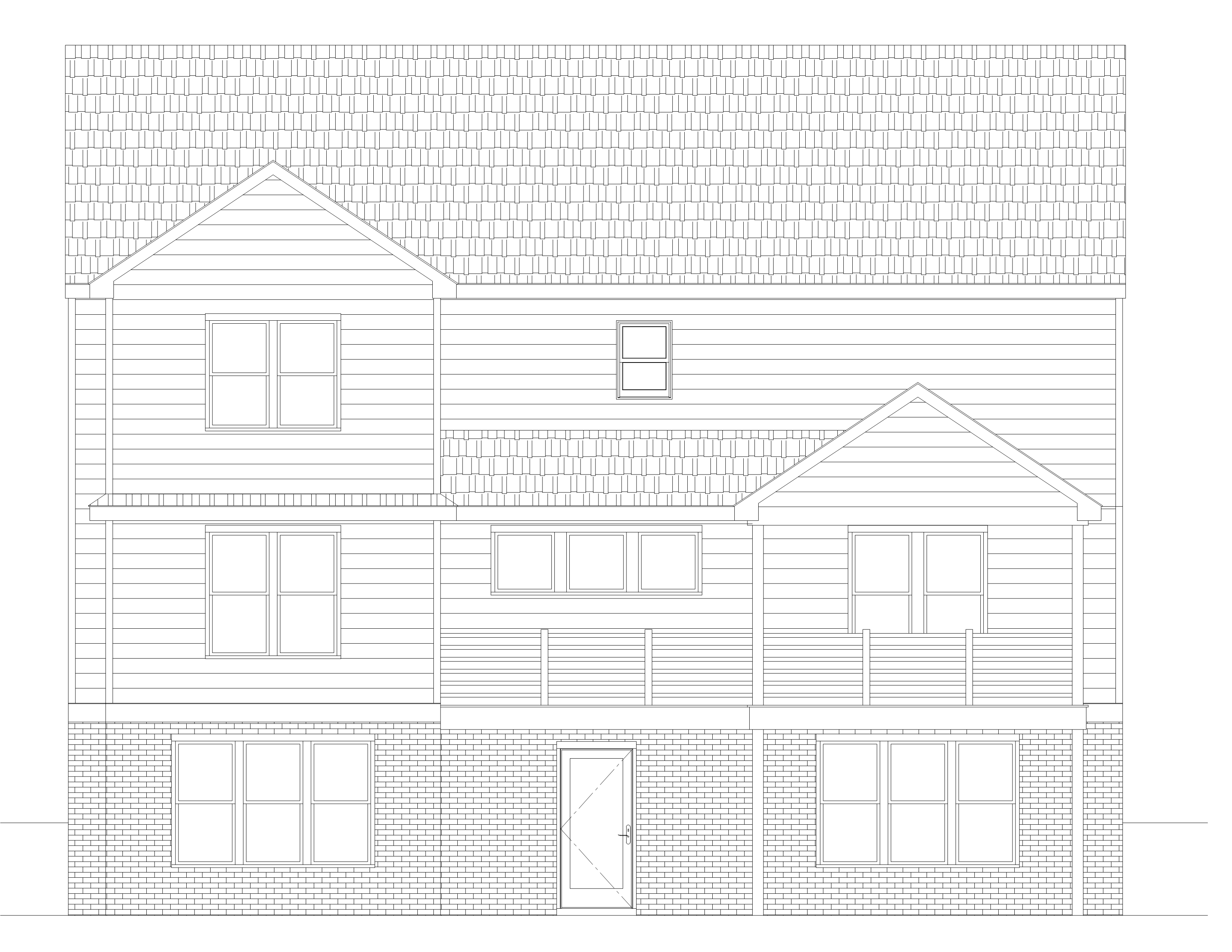 generate a beautiful rear elevation rendering of a two story house with a basement with a warm and inviting atmosphere the house features a modern design with a gable roof use soft pastel colors for the walls such as a gentle sage green and white trim for the edges and corners the roof should have a light grey tone with subtle shading to show depth the windows should have white frames and light reflecting glass set the scene during a serene golden hour with a partly cloudy sky casting a peaceful warm light across the house include a well maintained garden in front with lush green grass and colorful flowers like lavender and daisies to enhance the tranquil atmosphere the bottom level is brick veneer
