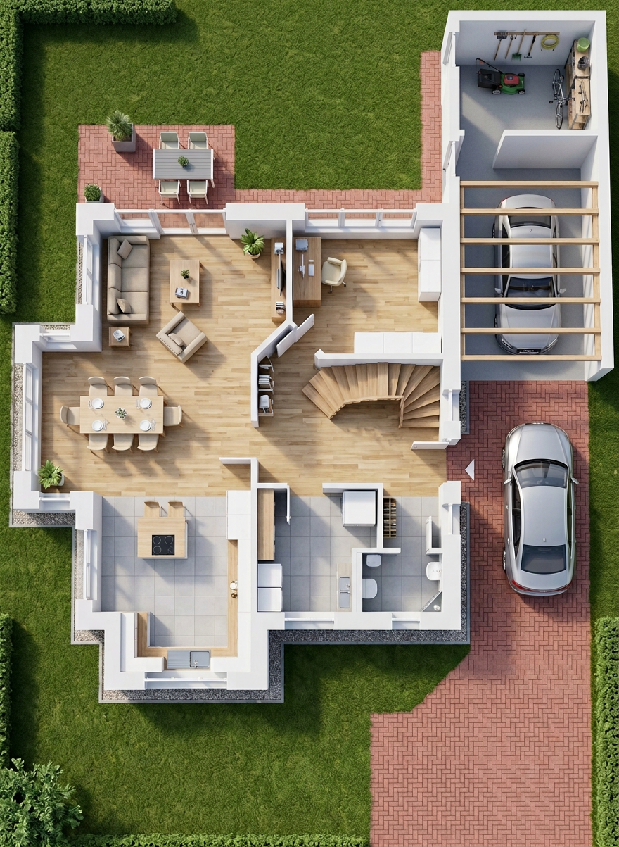 convert this floor plan into a realistic isometric 3d view of a full house show the space from an elevated angle with furniture walls and details visible isometric architectural visualization of a single story residential floor plan 164 m viewed from above at 45 degrees warm organic modern mediterranean style garage wing 48 9 m for two cars upper zone central corridor 22 3 m connecting all spaces private bedroom 16 6 m with adjacent dressing room and anteroom lobby open plan kitchen dining and living 53 5 m with oak island concrete worktop rattan pendant lights technical room storage toilet and laundry wet rooms along service spine south facing veranda 37 1 m with outdoor dining and lounge smooth sand toned lime render walls natural oak timber flooring in living zone travertine stone in corridor light concrete in wet rooms and veranda soft warm mediterranean daylight clean isometric projection cutaway walls at 1 2m showing full interior photorealistic materials 8k architectural cgi keep to the drawing don t add furniture use the same furniture as shows on the plan do not change the orientation of the floorplan