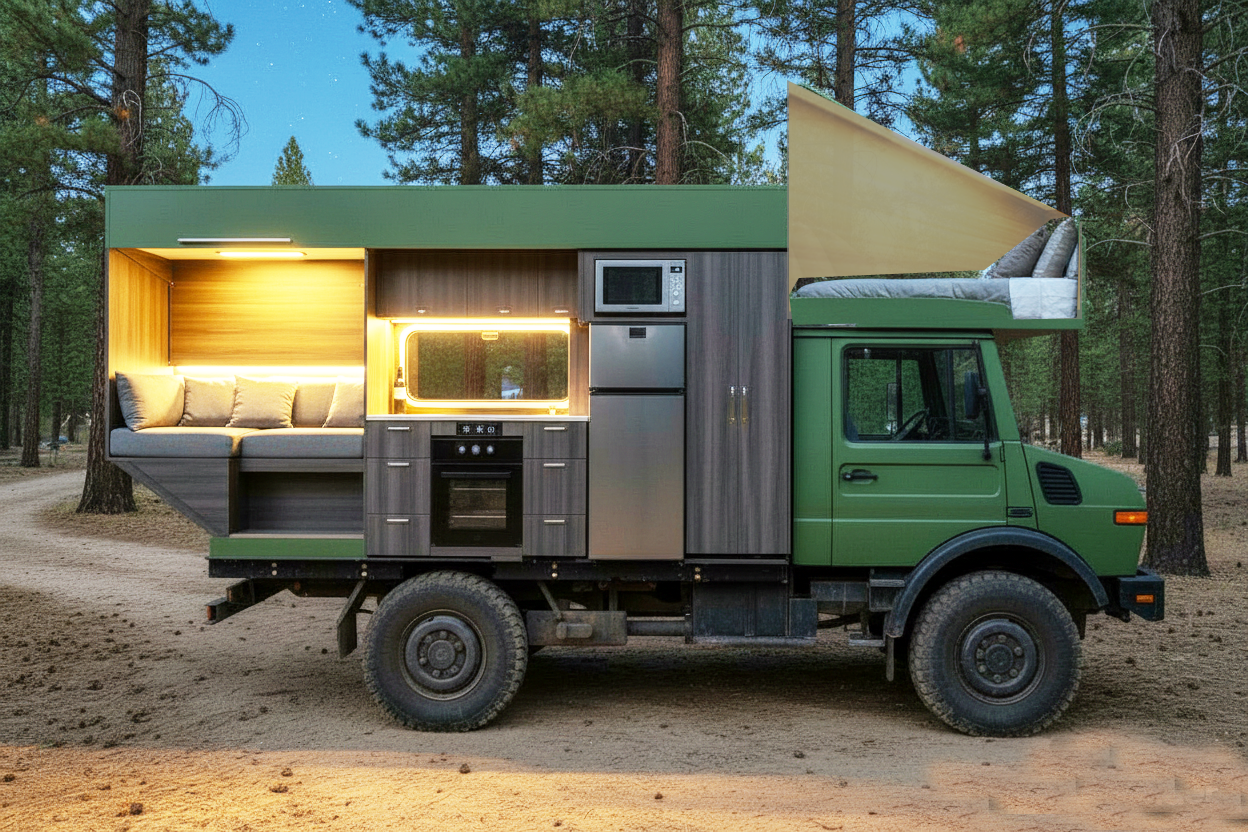 modernist exterior shot create a detailed rendering of a camper interior cutaway the seating area features a cozy modern design with plush light gray cushions and soft blue accents on the interior walls the cabinets are sleek with a dark wood finish offering contrast with the smooth metallic appliances polished in stainless steel with a roof campaing house the atmosphere is warm and inviting with soft lighting overhead illuminating the space include a large clear window with a scenic forested view outside adding a touch of nature to the ambiance the external vehicle structure remains in a technical sketch style highlighting the detailed interior against the minimalist outline of the vehicle architecture