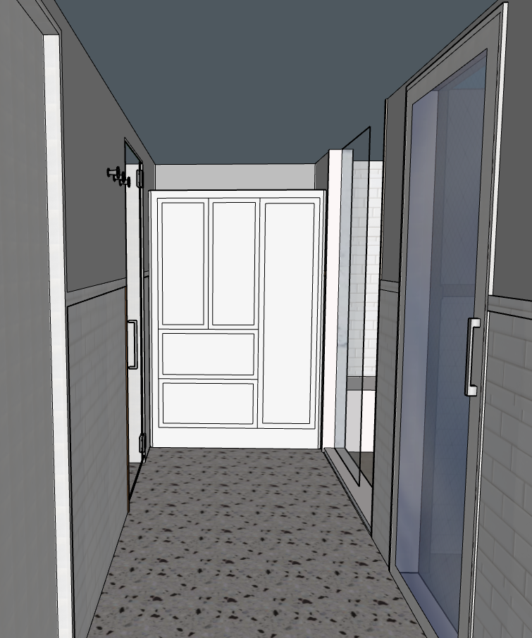 bathroom with white cabinets and white subway tile