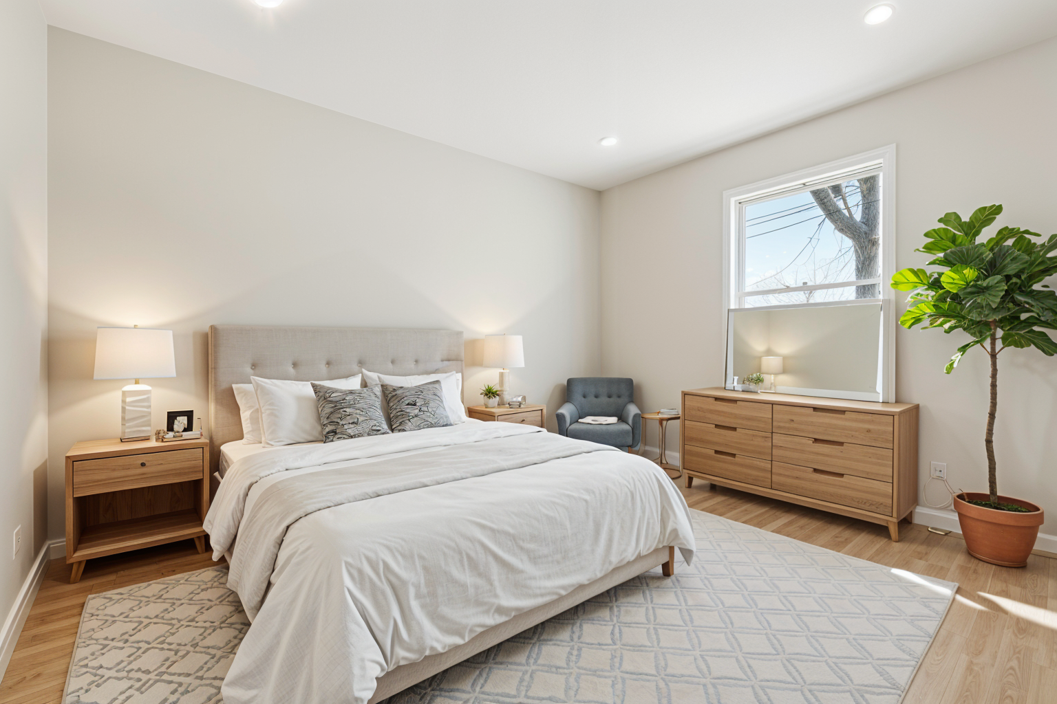 render a modern living room with sleek contemporary design use a soft neutral palette for the walls such as light beige or soft gray incorporate a plush l shaped sofa in a subtle cream color add a light oak wooden floor for warmth the shelves and tv stand should be in a matte white finish place a medium sized coffee table with a glass top and metal legs in the center use warm lighting with white or light gray light fixtures include some indoor plants in the corners for a touch of greenery the atmosphere should feel cozy inviting and minimalist with an emphasis on clean lines and open space