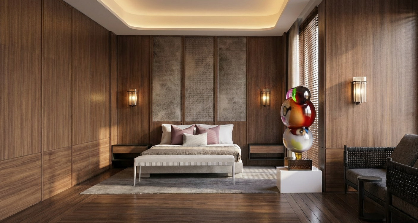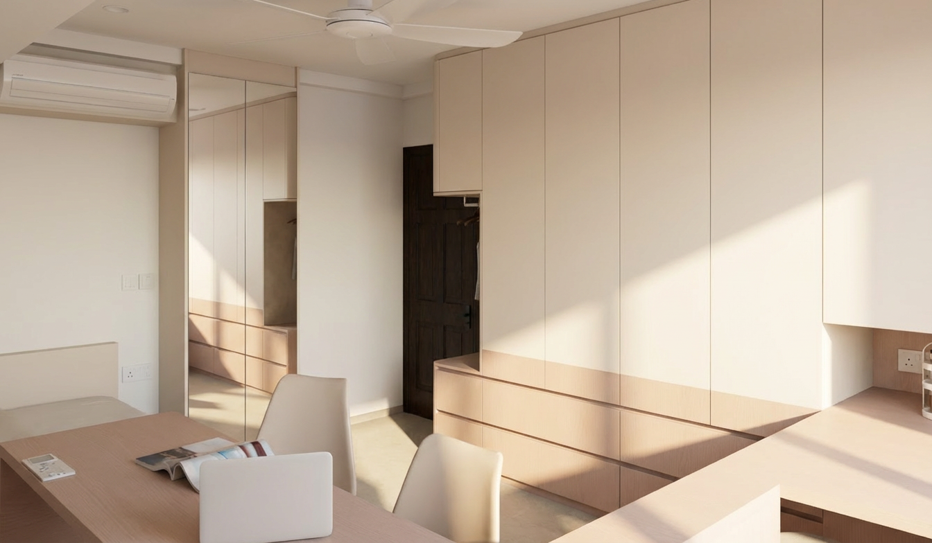colours to remain accurate as per original given picture wood texture to be subtle drawers and all table top surface in warm beige laminate with a soft blush pink undertone and subtle wood grain texture niche in light beige microcement and only bottom till study table in muted soft pink subtle wood grains top half of carpentry in solid colour light beige and only bottom till study table in muted soft pink subtle wood grains 2 doors full height cabinet in mirror recessed 150mm height skirting ontop ceiling in off white bed headboard in solid colour light beige floor in muted light beige vinyl subtle grains ceiling fan in white walls in off white sunlight coming in from the right side of room socket switch in white edge of wardrobe to be curved daytime but no sunlight coming in