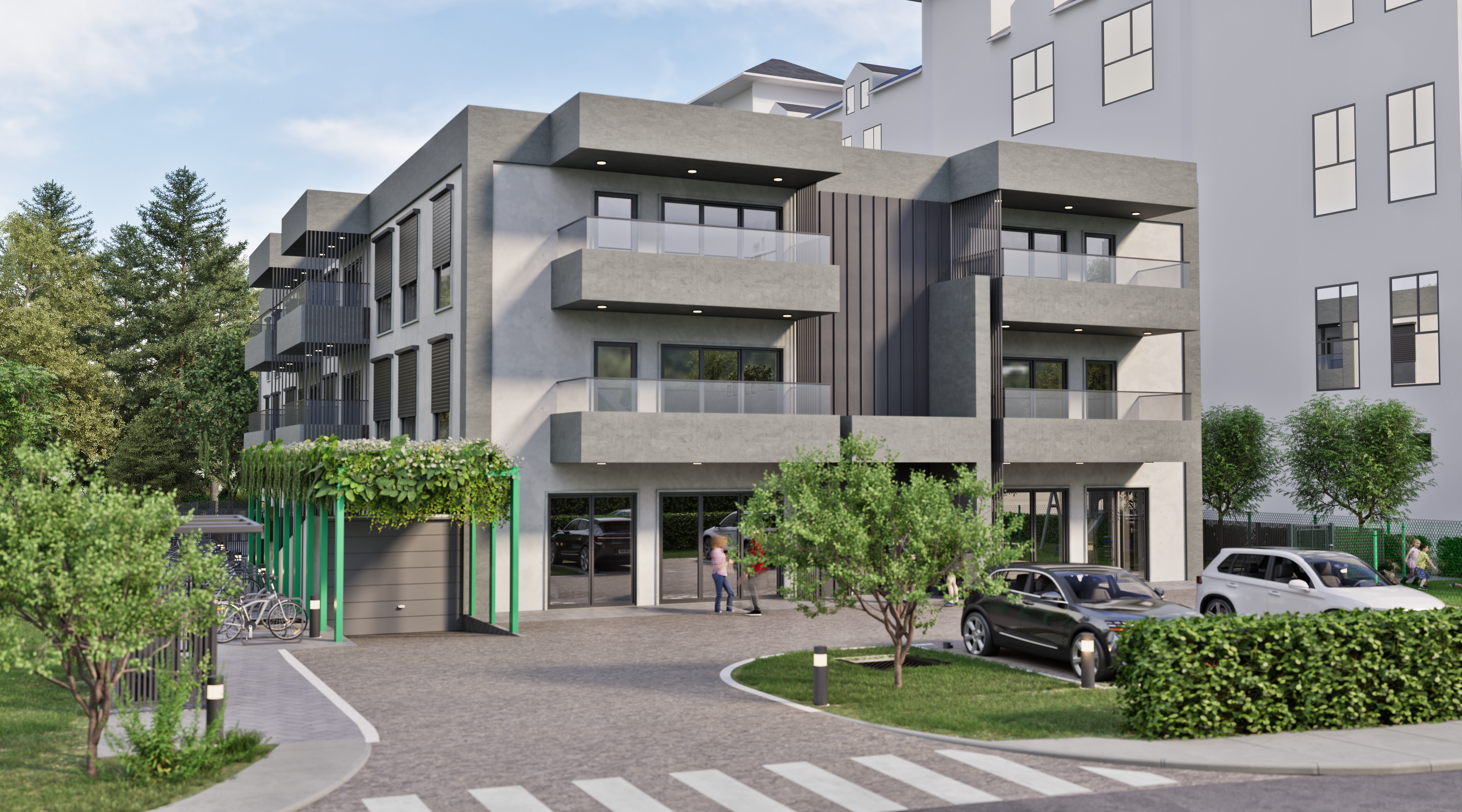 the color of the main facade should be vanilla the color of the balconies and corner accents should be 12 light brown the color of the green columns should change from green to black