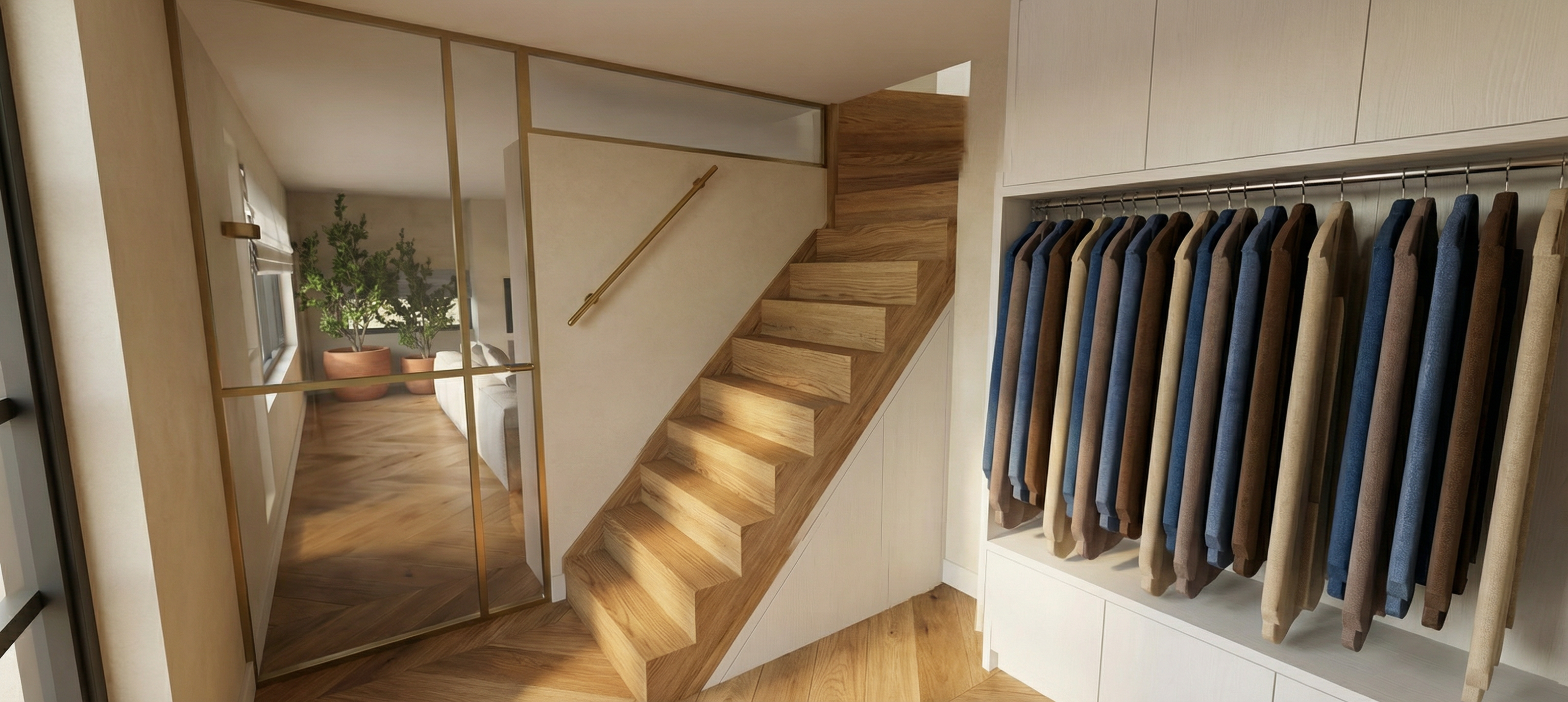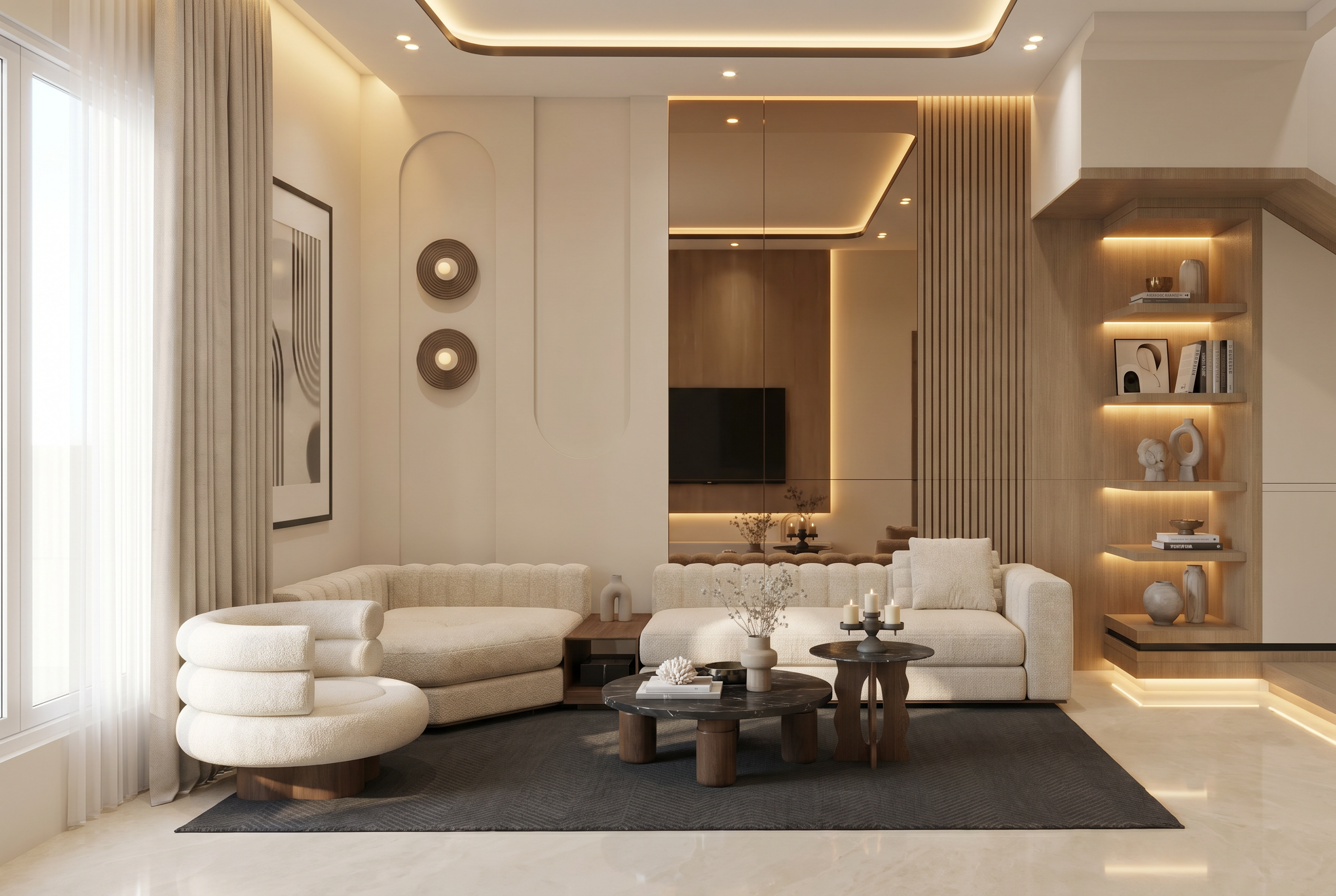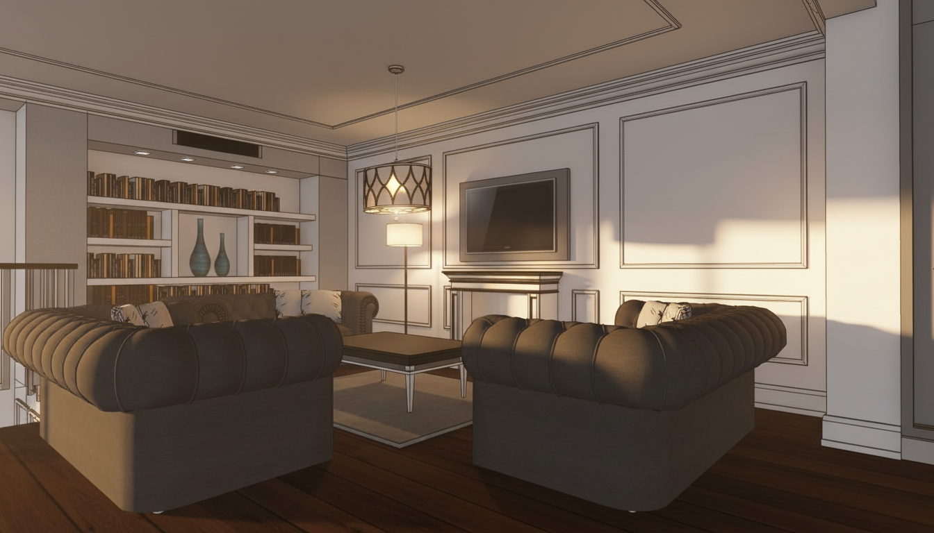 international style interior shot create a nice realistic interior visualization do not change materials maintain correct scale and proportions use physically accurate lighting with soft global illumination and high quality textures ensure precise details with realistic reflections and shadows the lamps are turned on and emit warm light with visible light sources keep natural exposure a nice view is visible through the window do not add stylization or artistic effects the result must be photorealistic withou window sun reflection on the left architecture