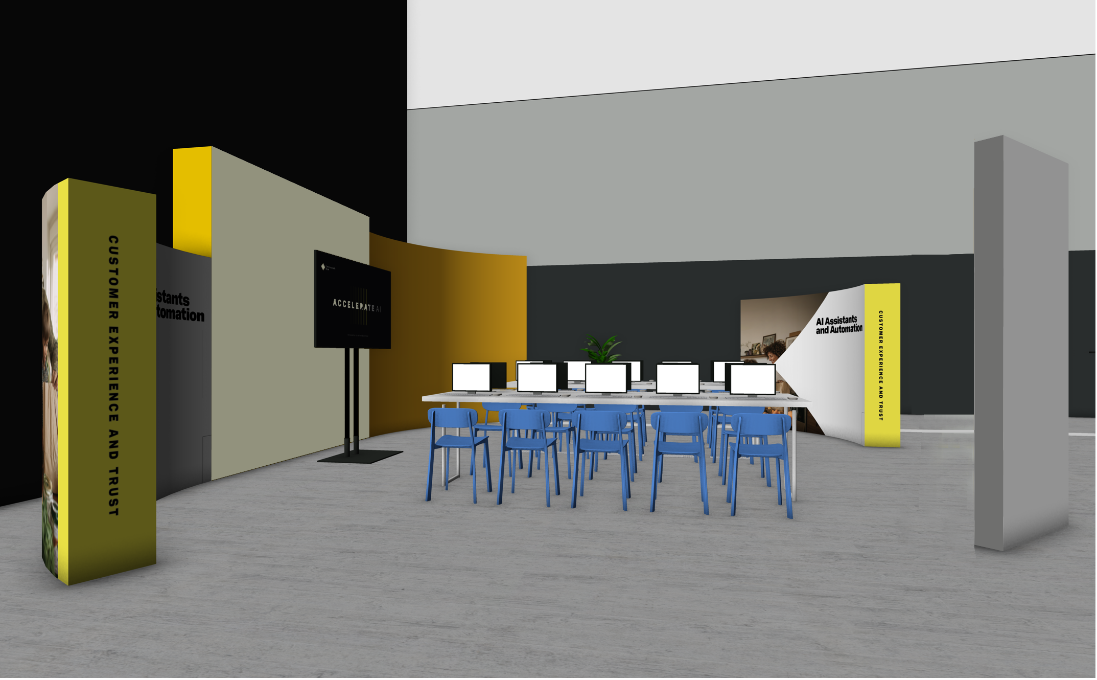 soft glowy lit scene space within an expo environment smooth seamless dark grey concrete fabframe on the straight walls lightbox on the right of the stage wall