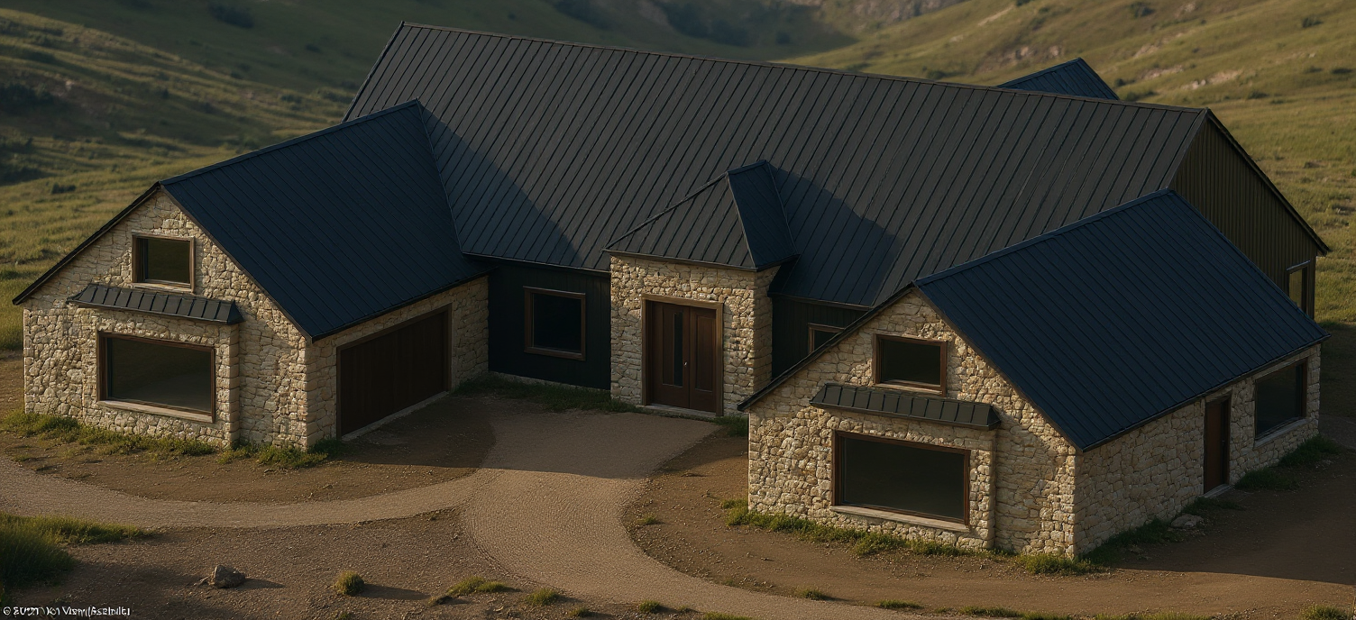 keep materials the same as the input photo and use verticle board and batten and dark metal standing seam roof