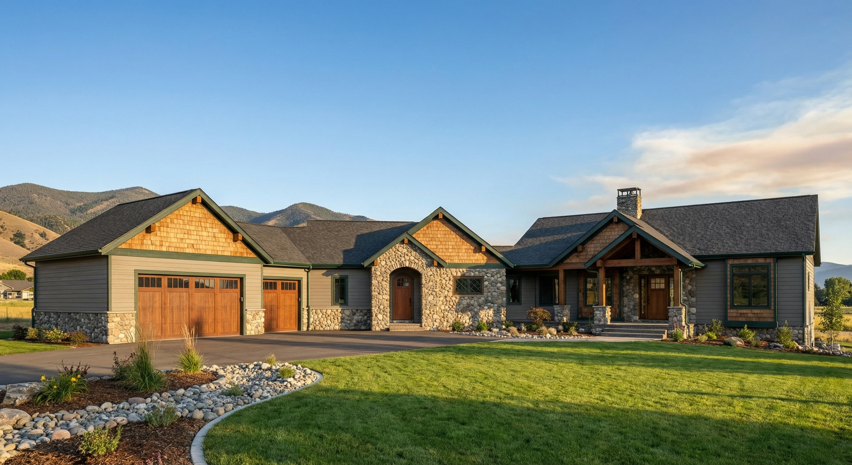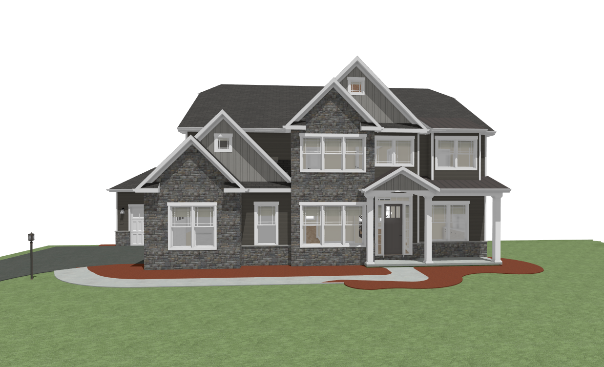 render this 3d image to appear photo realistic maintain all existing architectural materials and structural elements exactly as shown enhance the setting with a lush well maintained landscape include minimal beds manicured shrubs and a tree lined backdrop that frames the home naturally the windows should have a glossy finish with clear reflections of the surrounding trees and sky lighting should feel natural with soft shadows and realistic depth to bring the scene to life