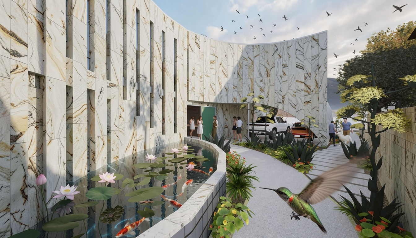 replace the orange tile with vertically oriented carrara marble tiles add blossoming lotus and koi fish to the water feature add people to the scene add a few birds in the sky and a humming bird in the foreground with motion blur on its wings