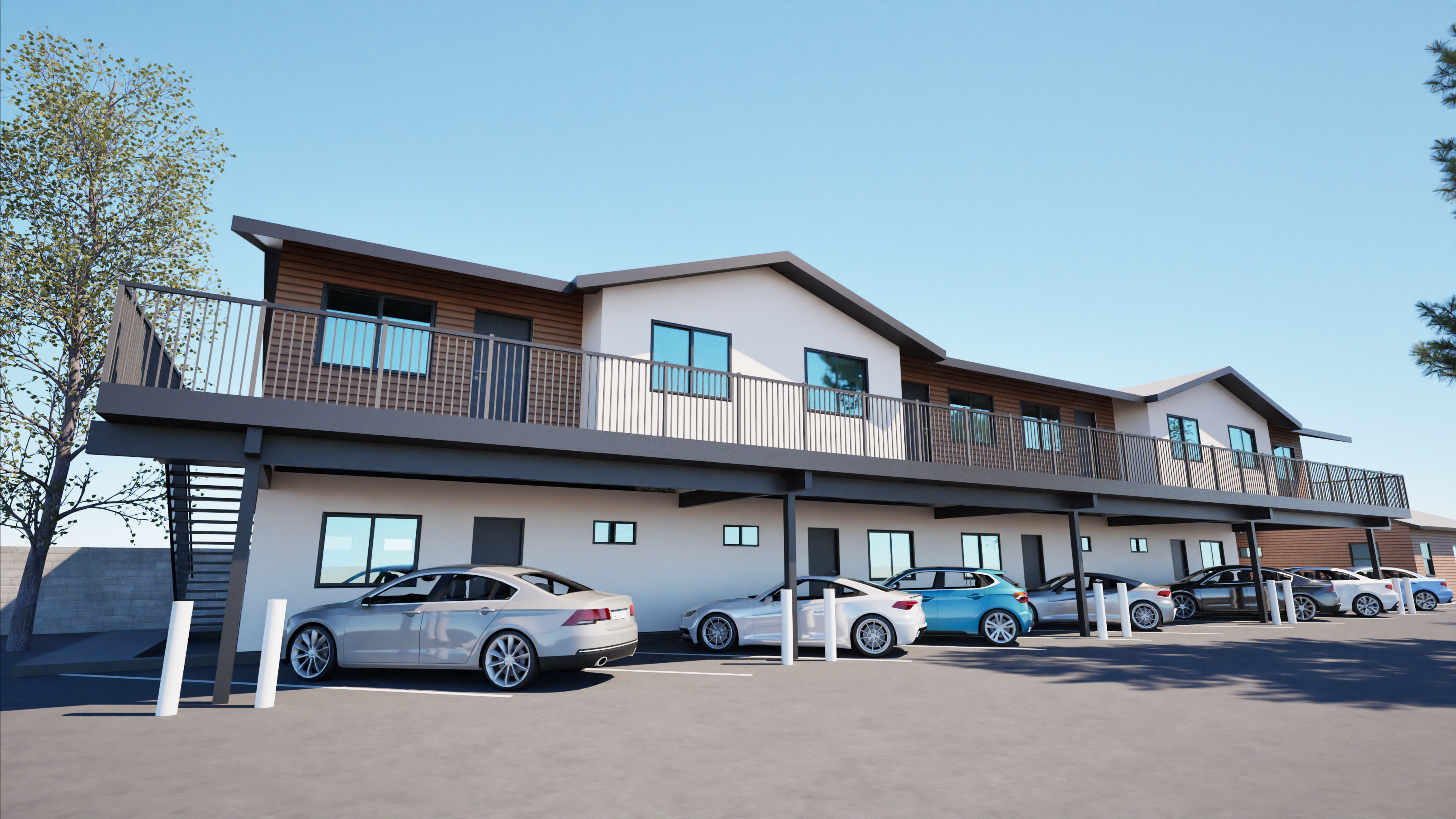 convert to realistic photo with apartments in the background and southern california native trees in sinrise setting