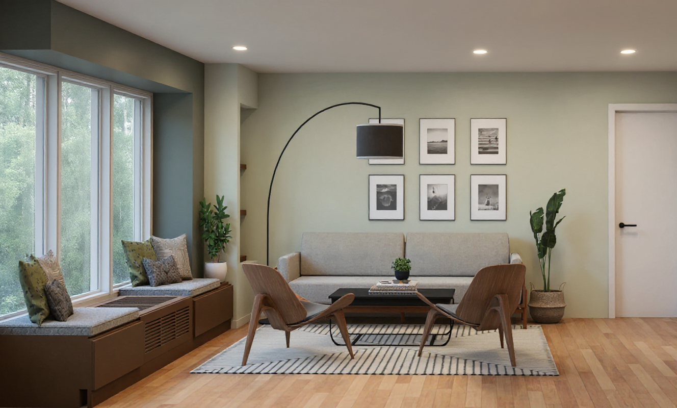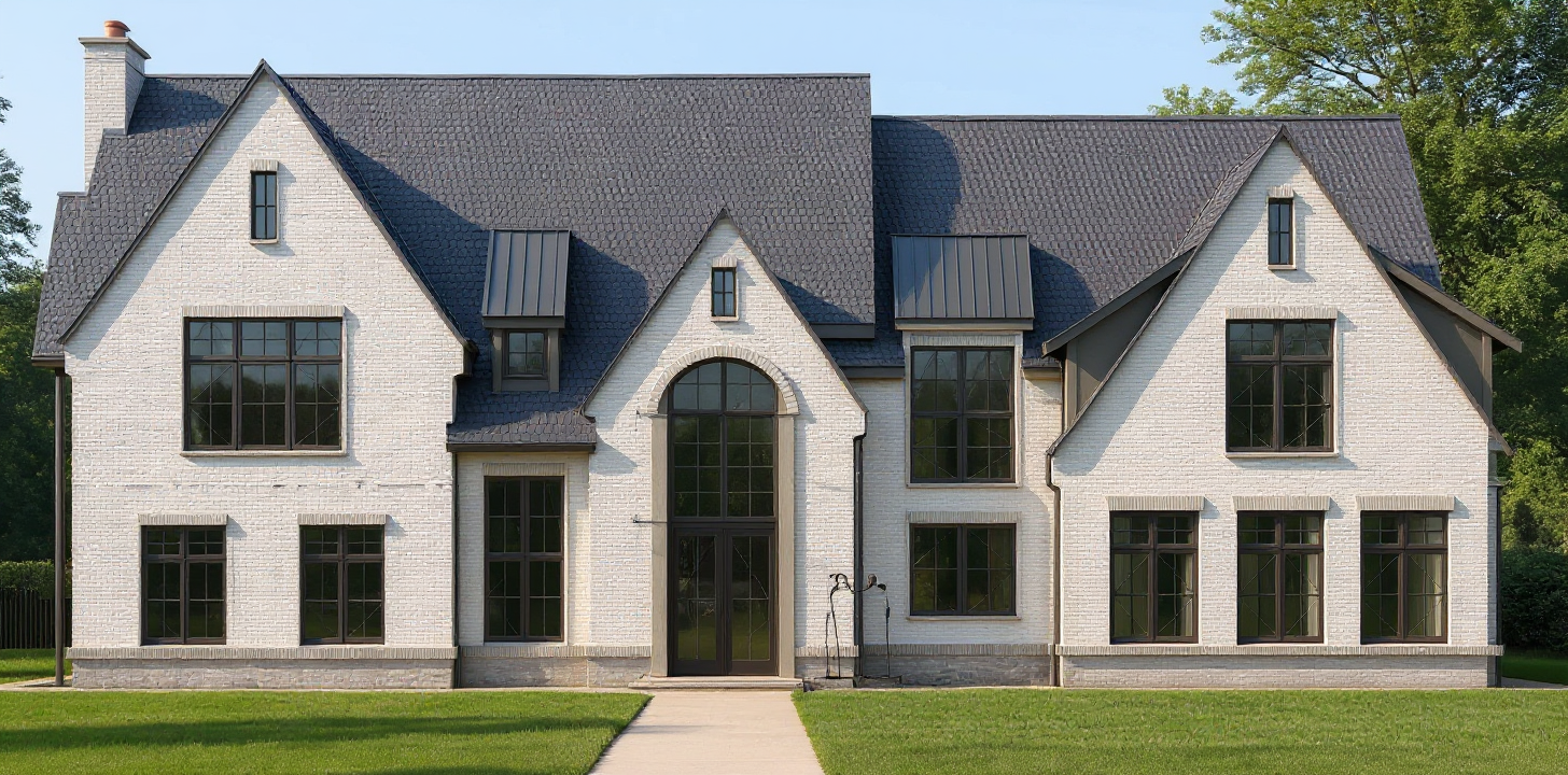 please make the large arched windown in the front door into two parts with a break right after the door in brick