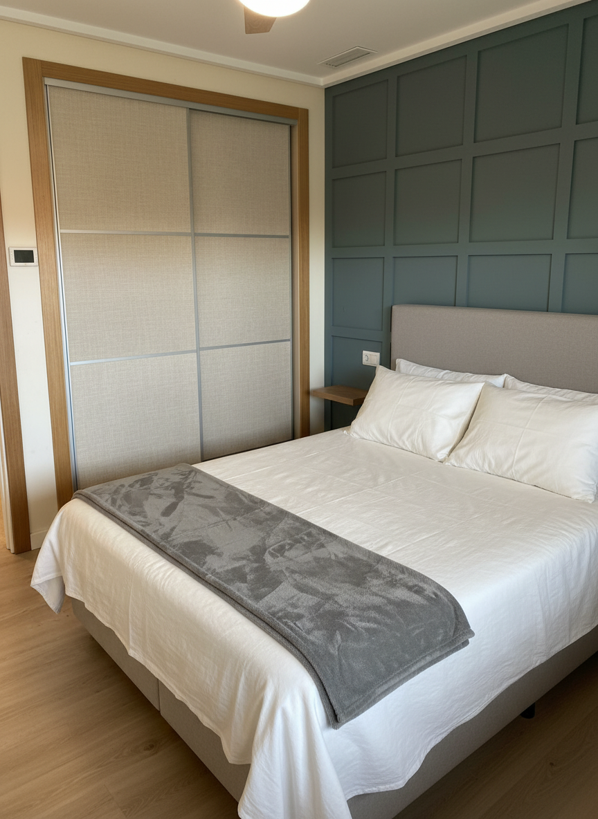 sustituye el dise o de la pared verde de madera sobre la que esta apoyada la cama por el dise o de la imagen de referencia pero en vez de color gris en color topo el resto no se modifica