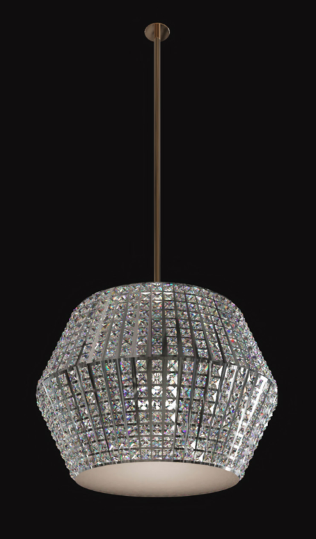 a luxurious crystal pendant light elegantly designed with a geometric faceted shape the light is composed of clear sparkling crystals set in a sleek brushed gold framework the fixture hangs from a slender brushed gold rod the atmosphere is sophisticated and opulent with the light casting subtle rainbow reflections the background is a deep matte black to accentuate the shimmering crystal details