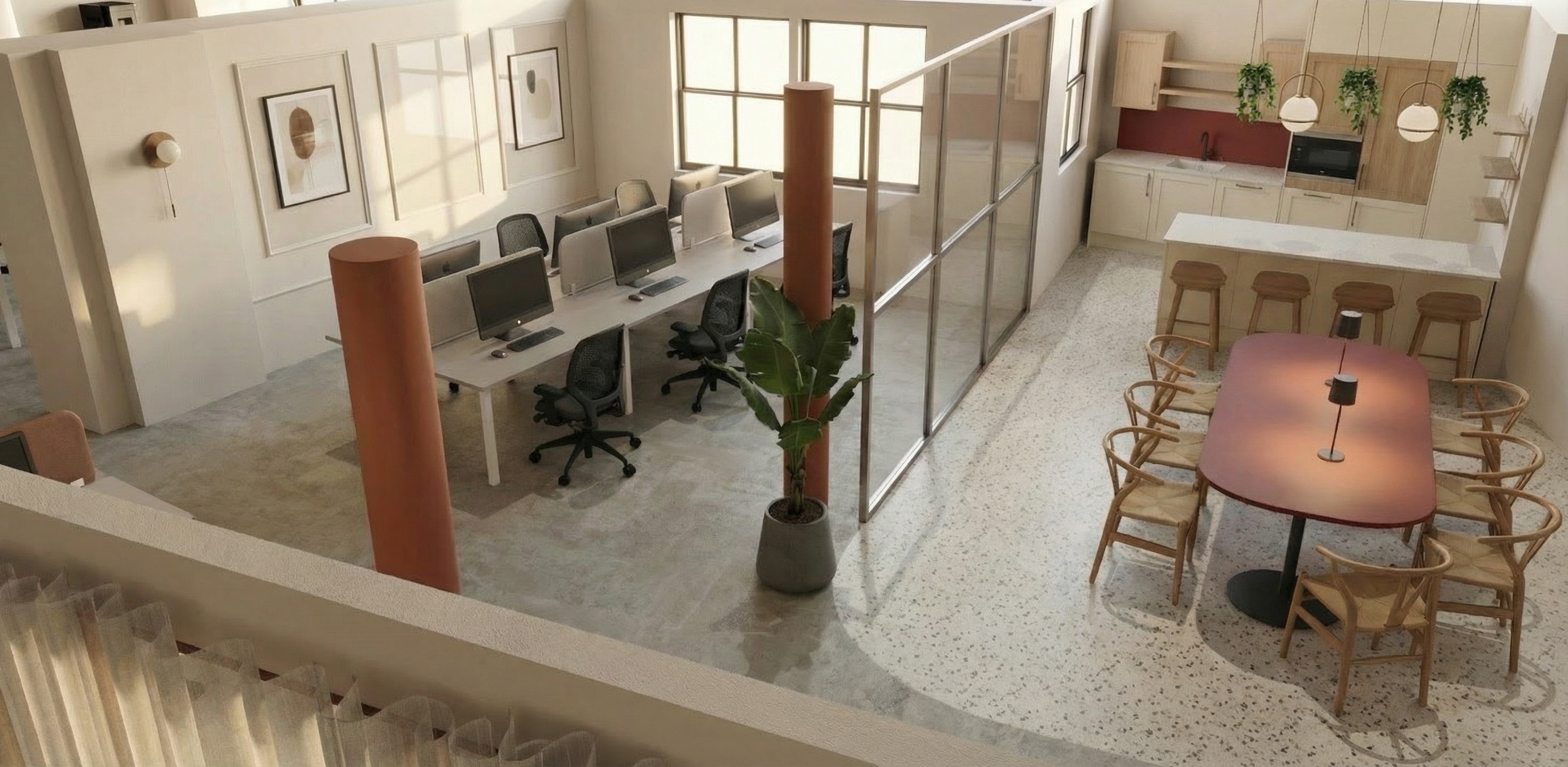 make the kitchen cabinets below the oak cabinets also oak to match make the frame of the glass between the tea point and desks ral 3005 wine red