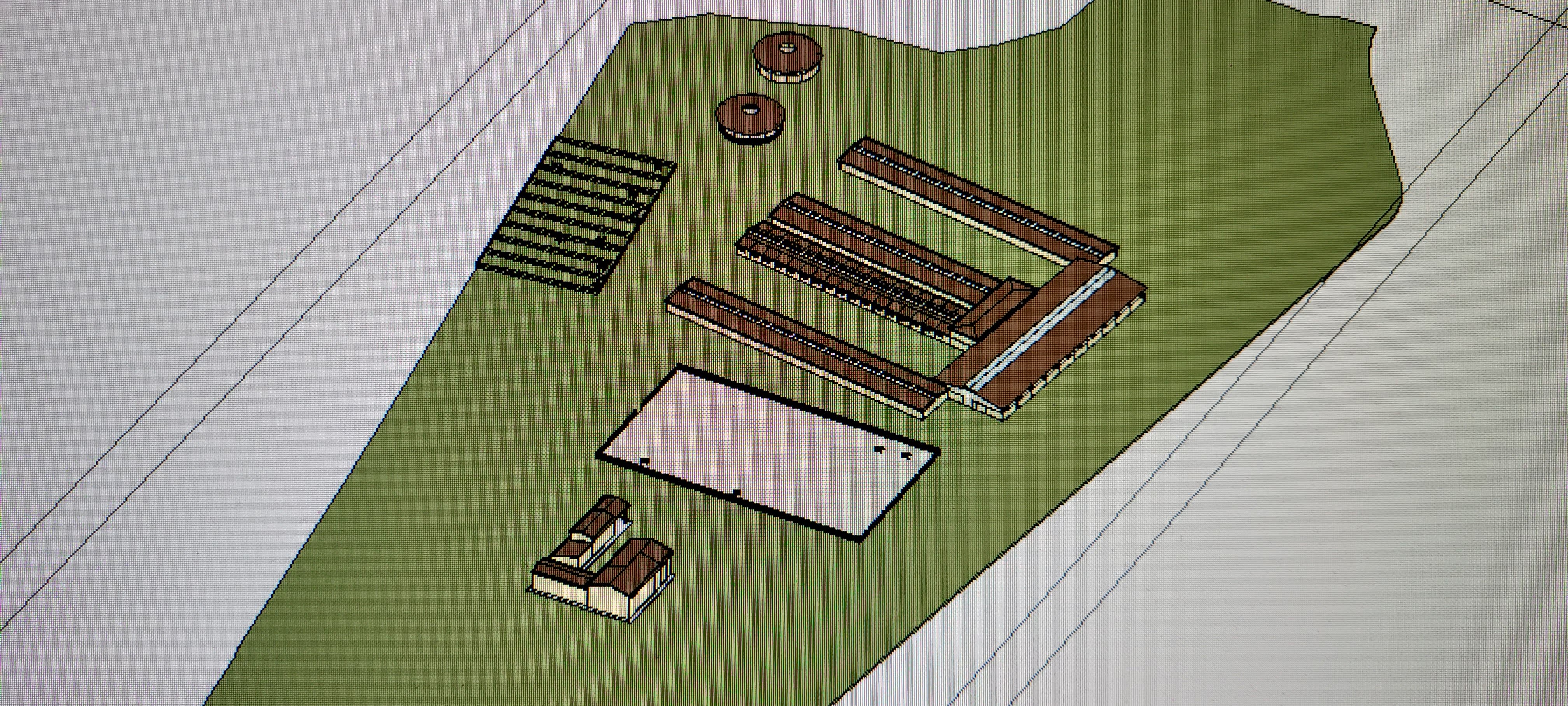 fai un render della scuderia per cavalli ambientato in un prato con alberi di ulivi e querce con un paesaggio alla base di colline verdi molto basse utilizzando colore per gli esterni con intonaco beige chiaro color tortora chiaro e infissi color panna mentre il rivestimento dei tetti e delle pensiline al piano terra devono essere in lamiera grecata color marrone testa di moro inserire anche pannelli fotovoltaici in copertura nel caannone piu alto infine inserire alcune porzioni di rivestimento esterno in pietra a listelli di fomato come mattoni sottili con tinte di color nocciola chiaro nei recinti della scuderia mettere qualche cavallo e molte auto nel parcheggio assieme ai camper con i rimorchi per cavalli