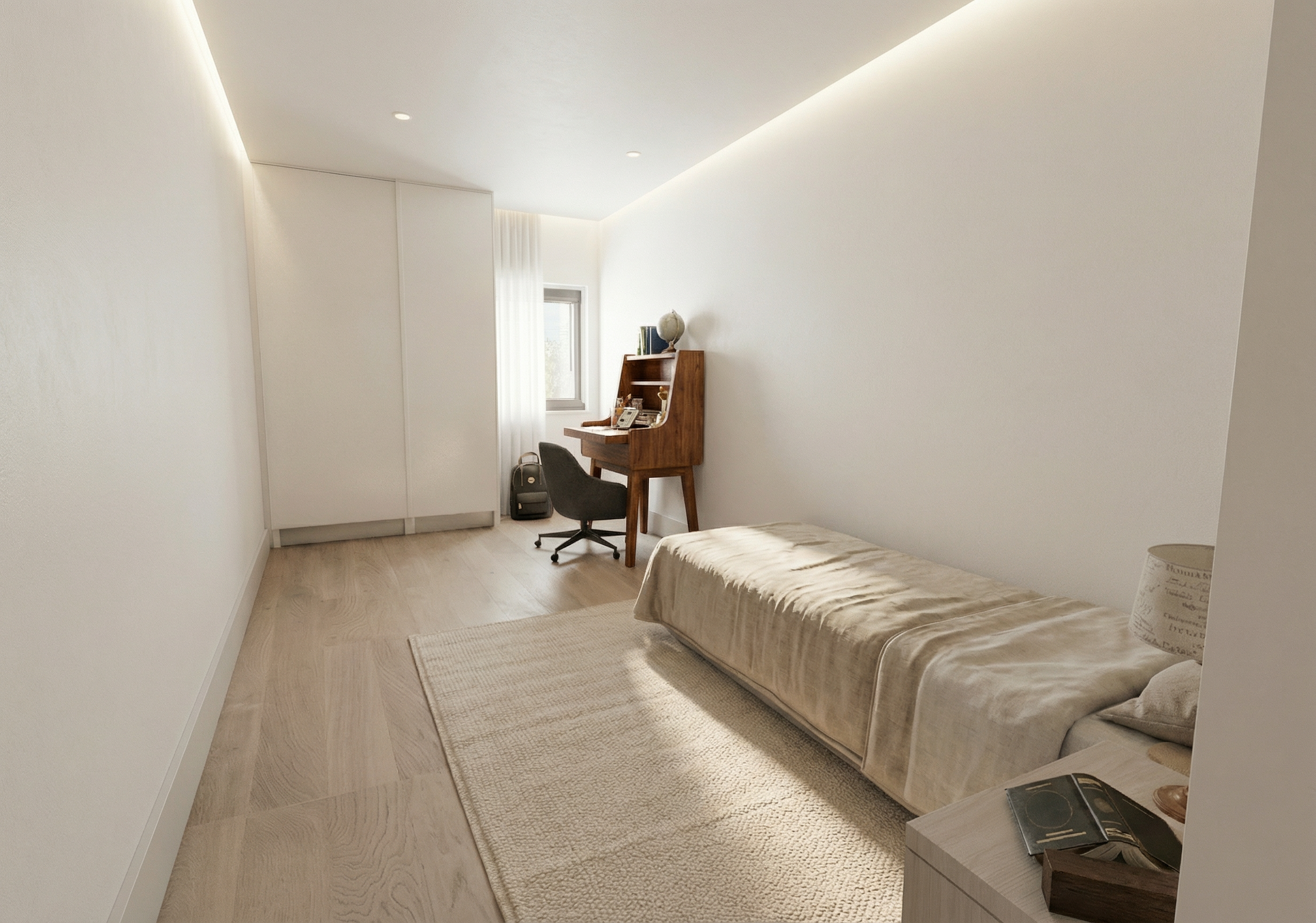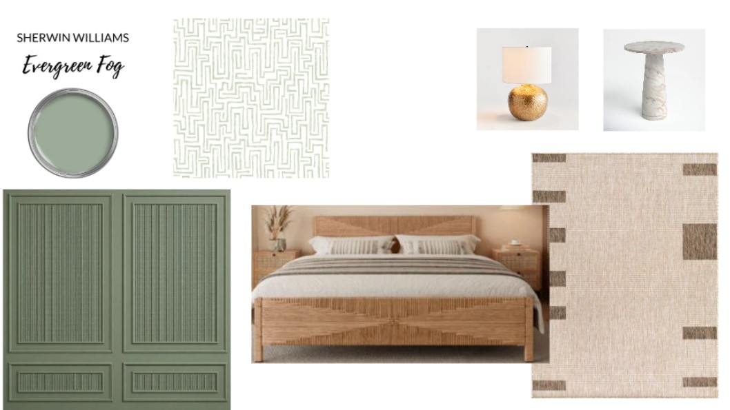 create an image of a guest bedroom in a luxury airbnb using all these elements put the green paneling on the walls behind the bed and the green and white geometric wallpaper on the ceiling include the bed and add led lighting where appropriate be creative put the green wall panels on the wall behind the bed only