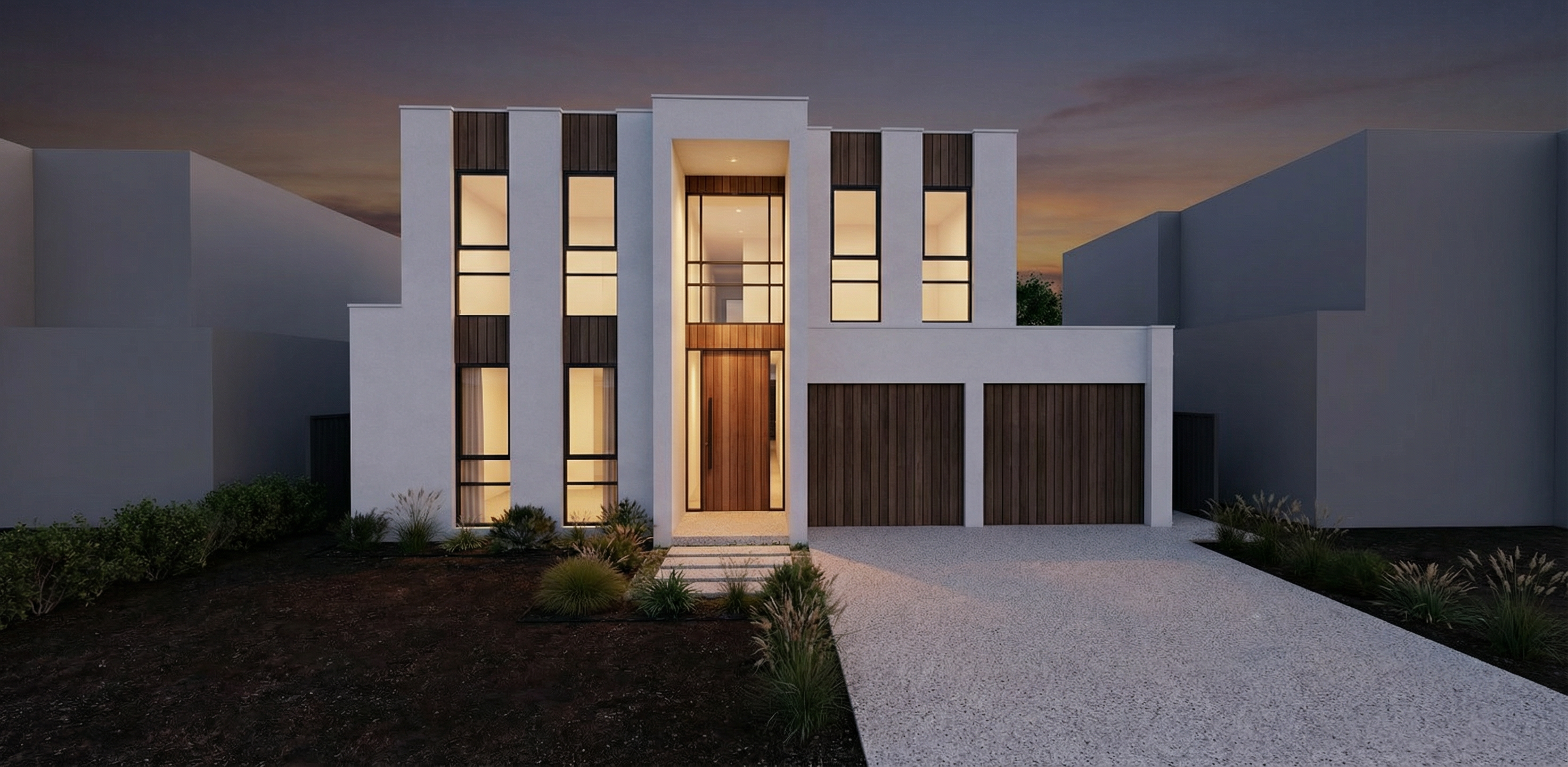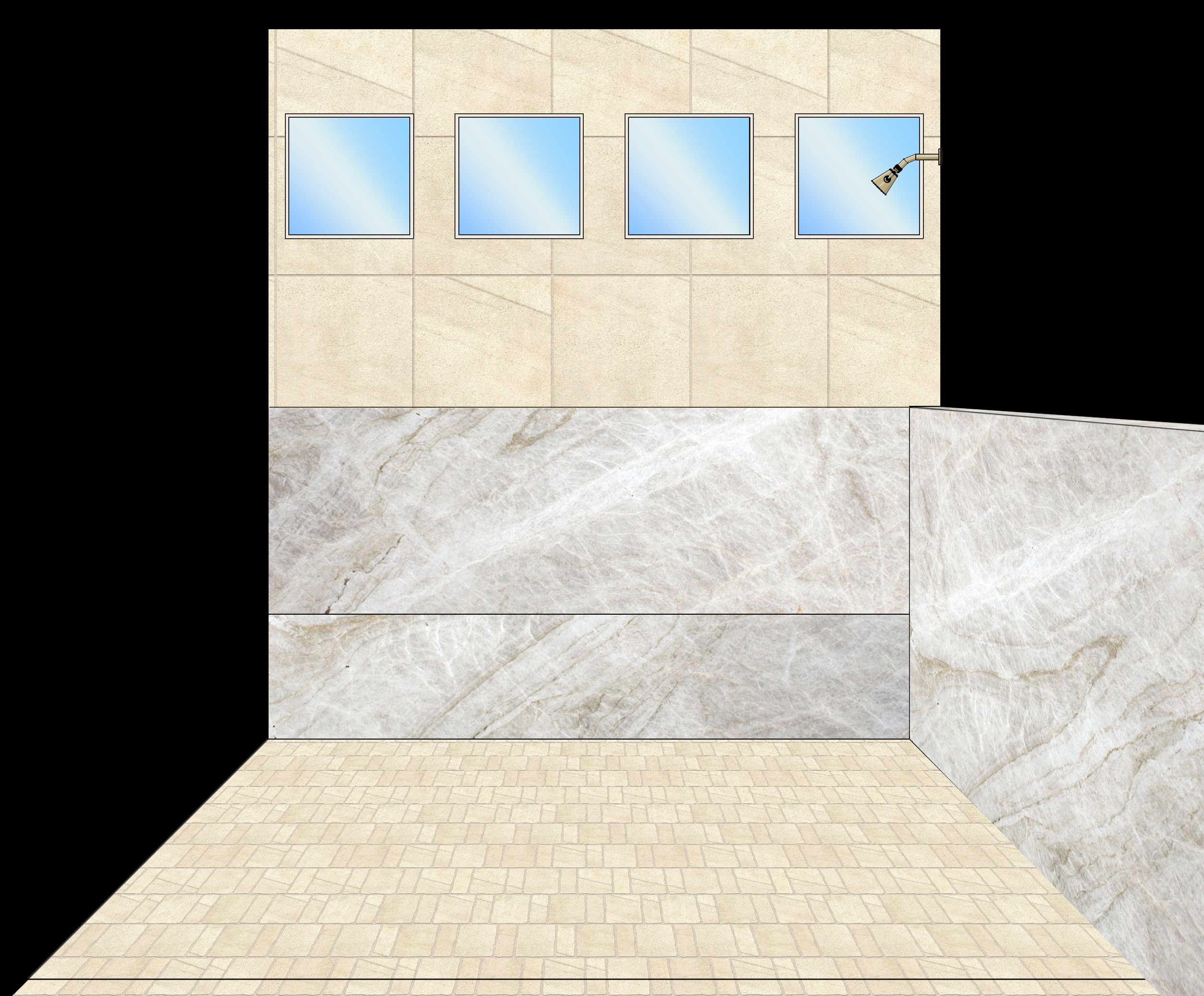 photorealistic interior shower elevation 2 brass showerheads on right block style slab covered bench on back wall matte floor and wall tile glass on left to tub slab