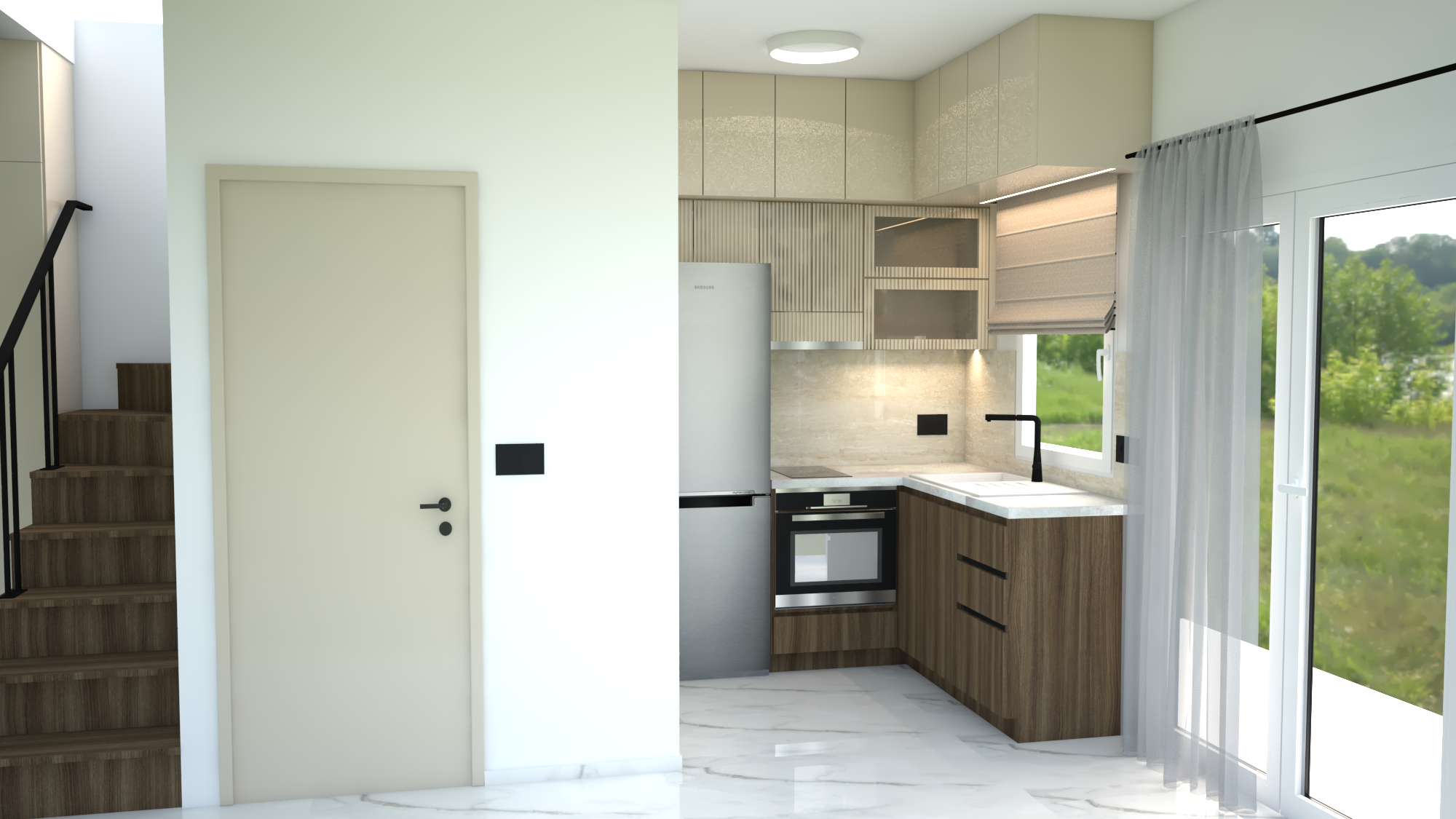 create a beautifully rendered modern kitchen interior the atmosphere is serene and bright the cabinets are a soft beige color complemented by a light wooden backsplash the countertops are a smooth polished stone in a soft beige tone the kitchen flooring is glossy white marble adding elegance the refrigerator is stainless steel reflecting light subtly the staircase features rich dark wood steps and sleek black handrails the door is a light cream color creating a soft contrast with the wall the large window lets in abundant natural light illuminating the sheer gray curtains gently the lighting is warm and inviting lush greenery can be seen through the window creating a refreshing connection with nature