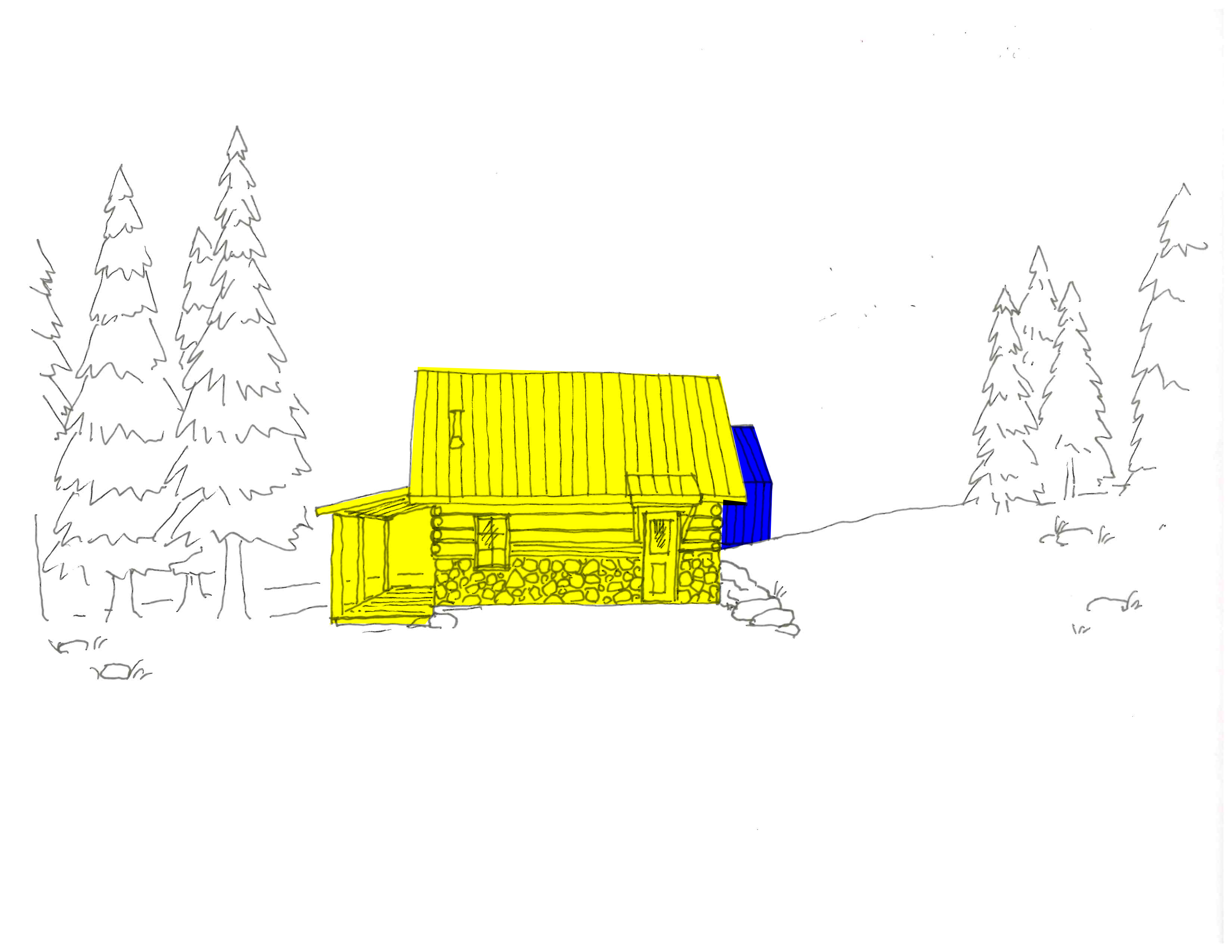 color exterior rendering yellow part like view 1 reference image site like view 1 reference image blue part like ref 2 image roof in yellow part to be standing seam with snow on it like in view 1