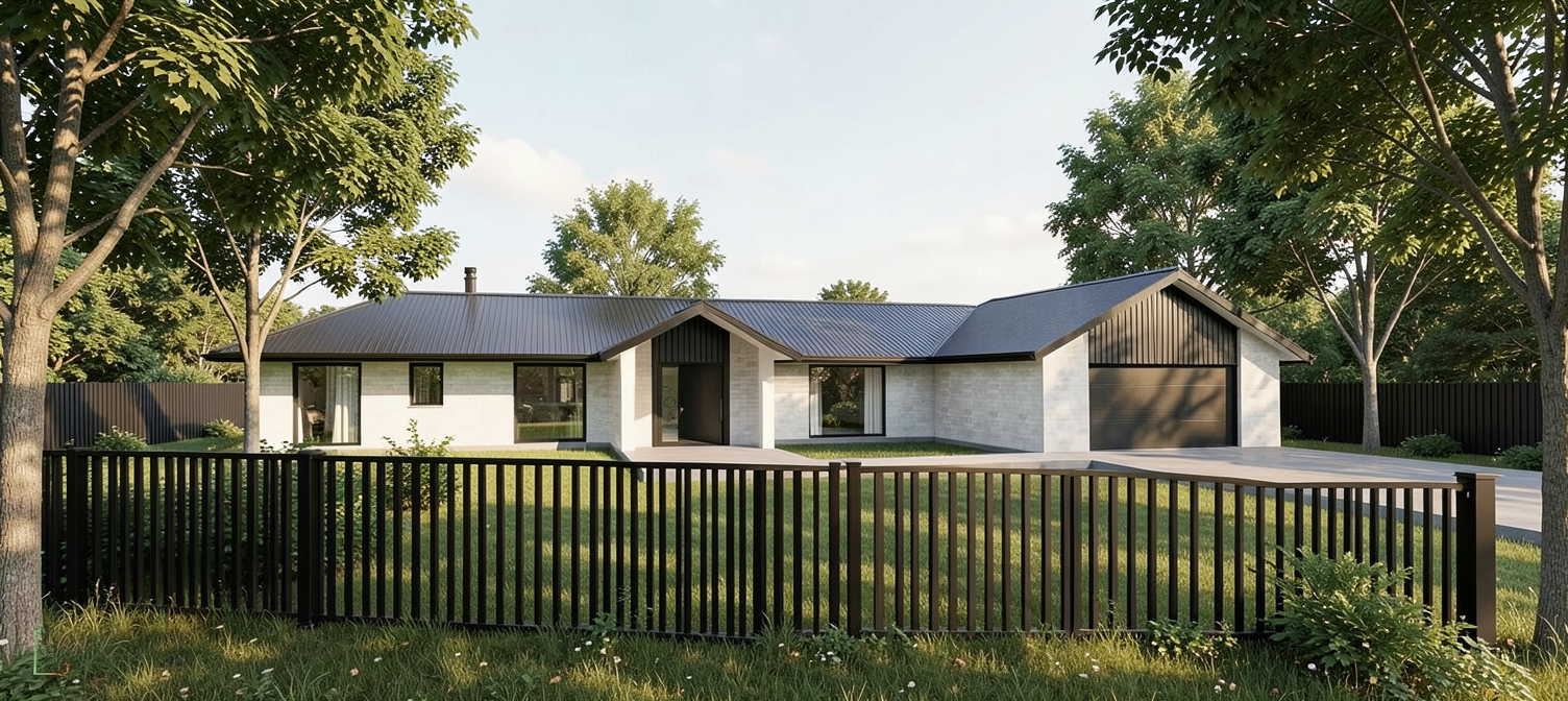 slat fencing no plants a few trees no curtains