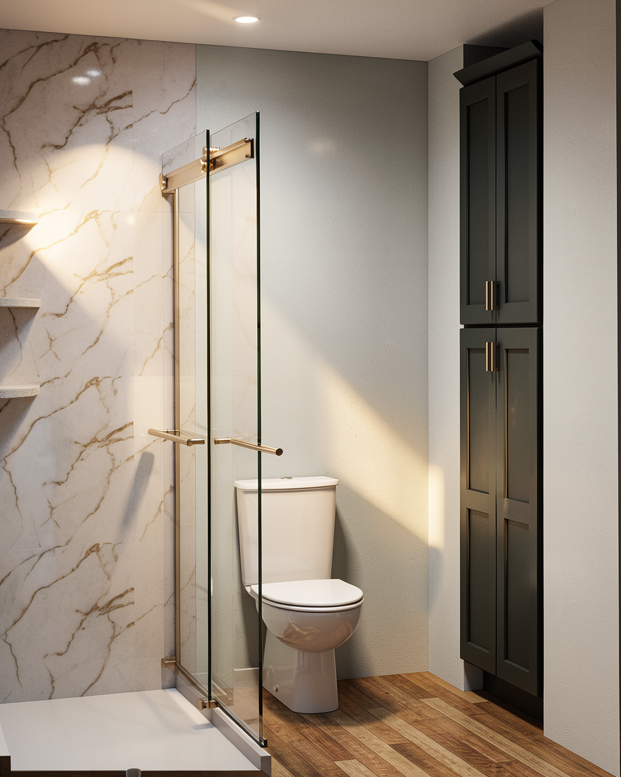 render a beautiful detailed residential house with multiple peaked roofs and a charming turret use soft slate grey for the roof light blue for the exterior walls and warm wooden tones for the garage doors and main door add elegant white window frames the stone foundation should be in a natural earthy color set the house against a lush green lawn backed by a forest creating a serene and inviting atmosphere with a clear soft sky above keep the screen porch structure but add architectural details such as window grills