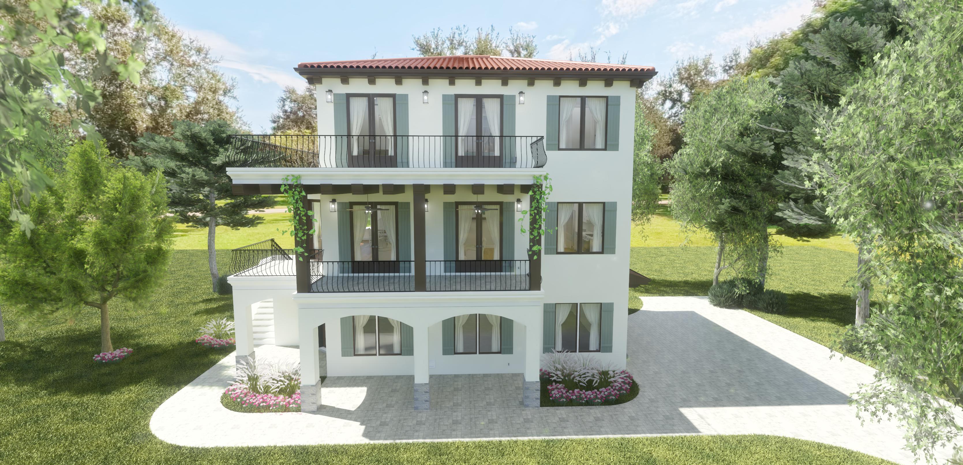 replace background sky with a sunny blue sky with puffy clouds add lawn and landscaping on both sides of the yard