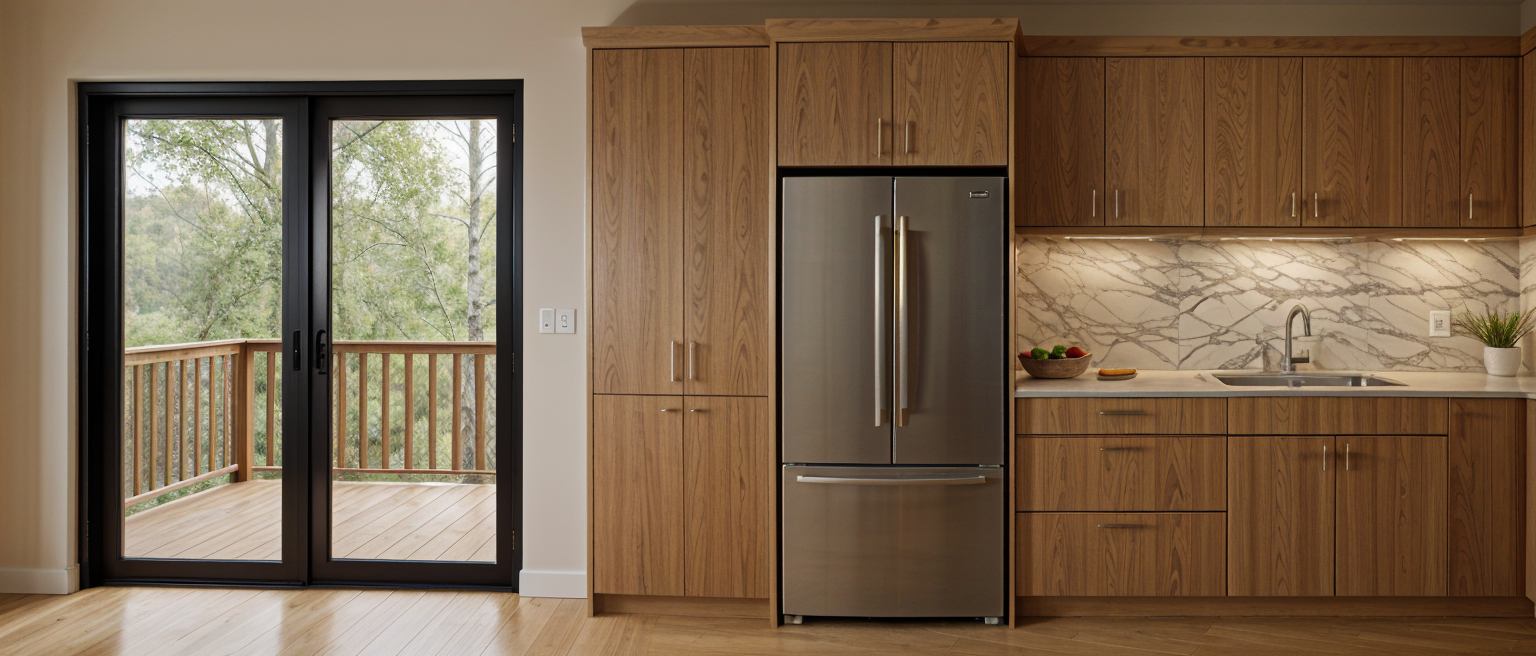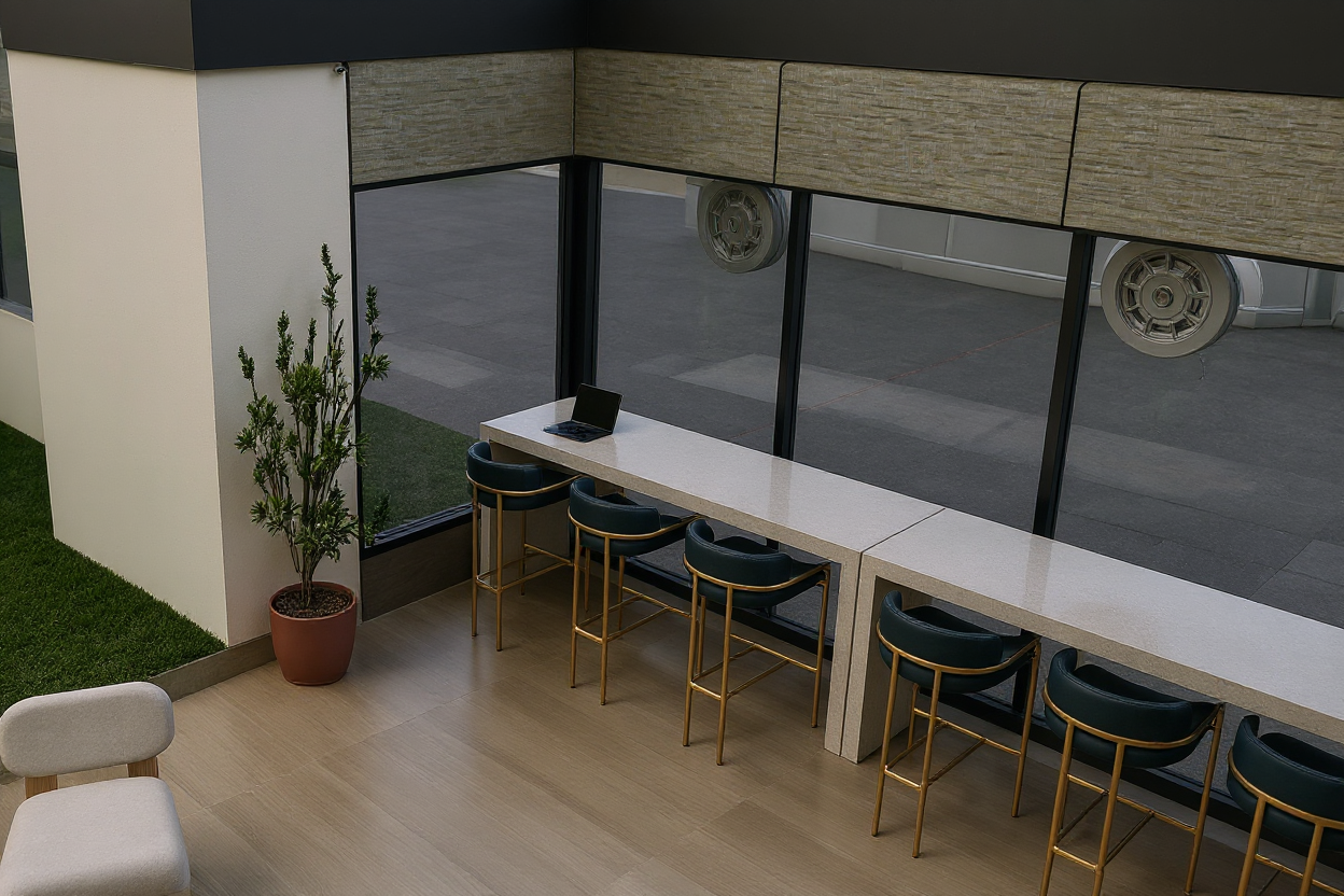 standing on a dock looking back to the building in the background is a parking lot with tropical trees and palms beyond the parking lot the foliage is close to the left side of the building parking is to the right the building is very pale yellow with white trim the roof is light color metal the sun is setting in the distance
