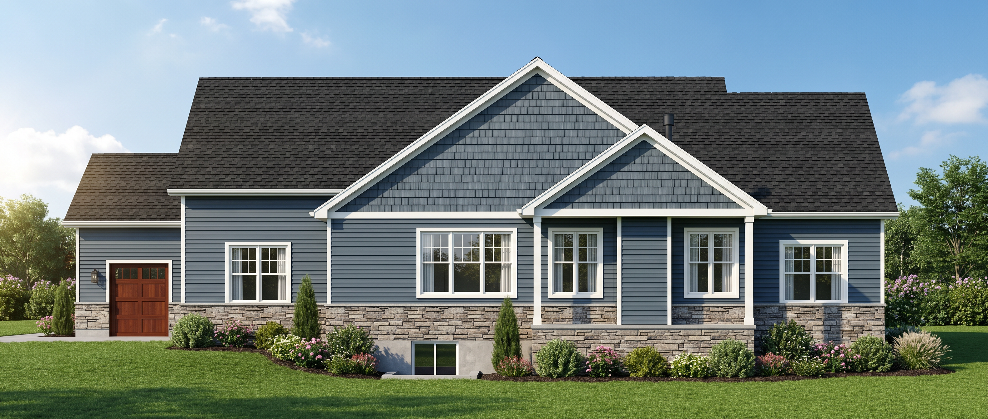 create a 3d rear rendering with all structural elements drawn untouched apply the following selections a wolverine blue storm siding and timberline hdz charcoal black shingle roof dutch quality stone elkwood weather ledge stone veneer white windows white trim there are no doors except the golf cart size garage door this should be mahogany seed 10