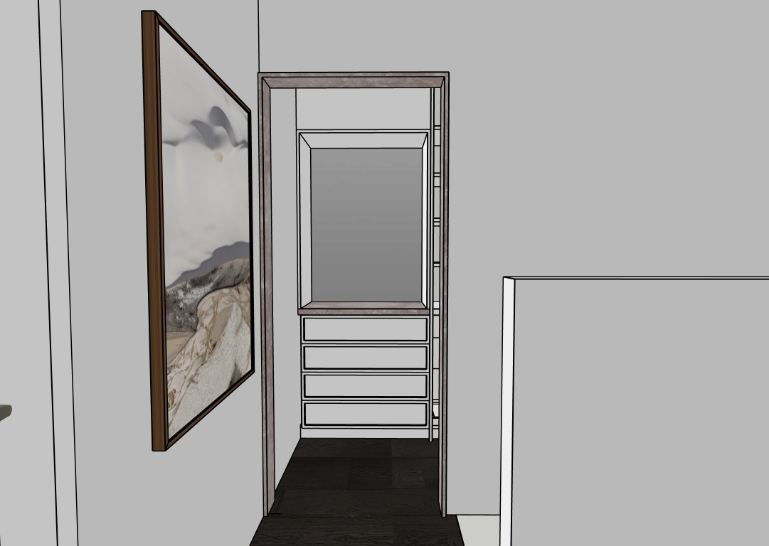 walk in robe with indirect lighting japanese black timber flooring cabinets in polytec natural cotton breccia rosso marble frame detail and mirror inside