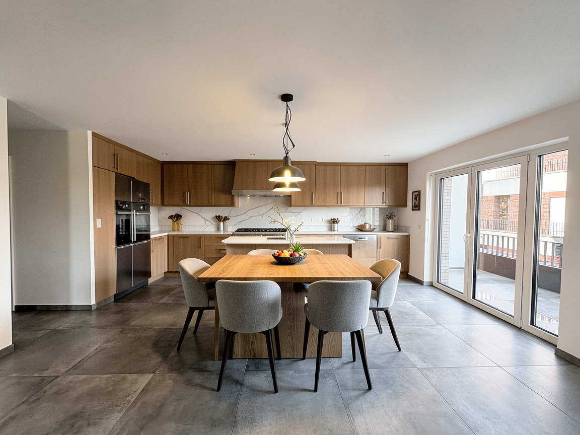 an die wand soll eine k che installiert werden und mittig davor muss ein esstisch mit vier st hlen die k che soll nur an die wand direkt vor kopf und nicht noch links oder rechts weitergef hrt werden gestalte das ganze hochwertig und gem tlich ver nder das grundbild nicht und lasse den grundriss so wie er ist sodass du nur die m bel hinzuf gst an der decke sind kabel f r davor hergesehene lampen