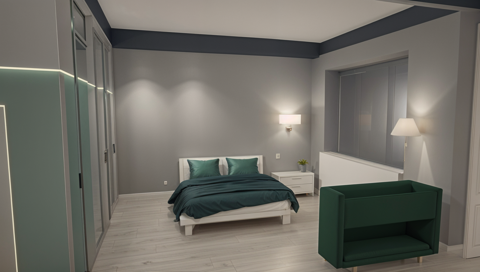 art deco interior shot a room in a modern classic style with light sand beige walls with a large double bed with blankets and beautiful pillows the protruding wall behind the bed is decorated with decorative vertical slats or stripes next to it is a classic style wardrobe in pastel colors with gold handles also on the side of the bed is a bedside table above the table hangs a sconce that shines a modern chandelier hangs on the ceiling illuminating the room modern roman style curtains hang on the window the skirting board is made of a decorative grille in the same color as the wall and there is also the same decorative grille in the same color as the wall under the window architecture