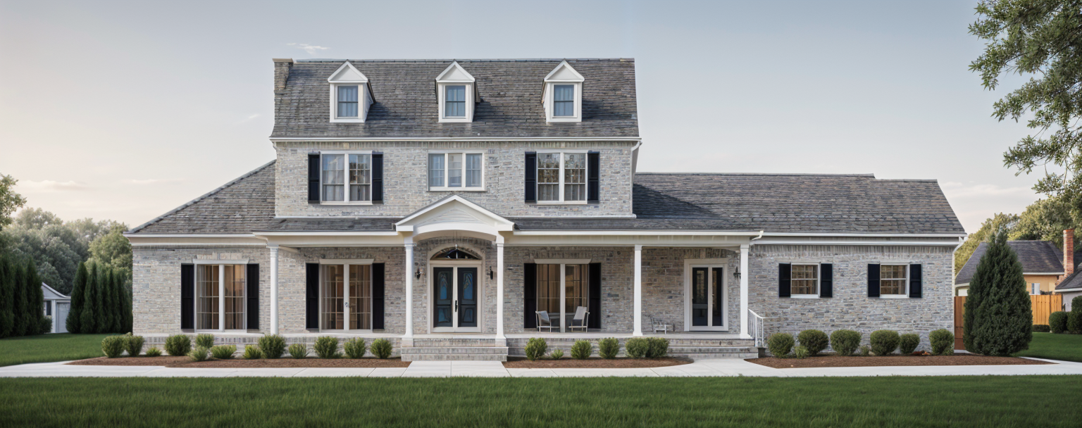 classical exterior shot the exterior is painted white brick the shutters are a light grey the roof is a dark grey slate the windows are white architecture