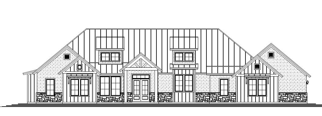 barndominium exterior shot cream stone wth black siding and black roof architecture