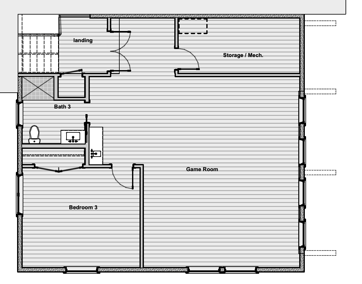 modernist exterior shot rendered floorpan for a real estate brochure tiled bathroom carpet bedroom game room with couch seating area and ping pong table stairs down in the upper left architecture