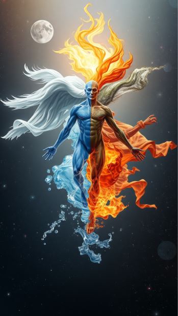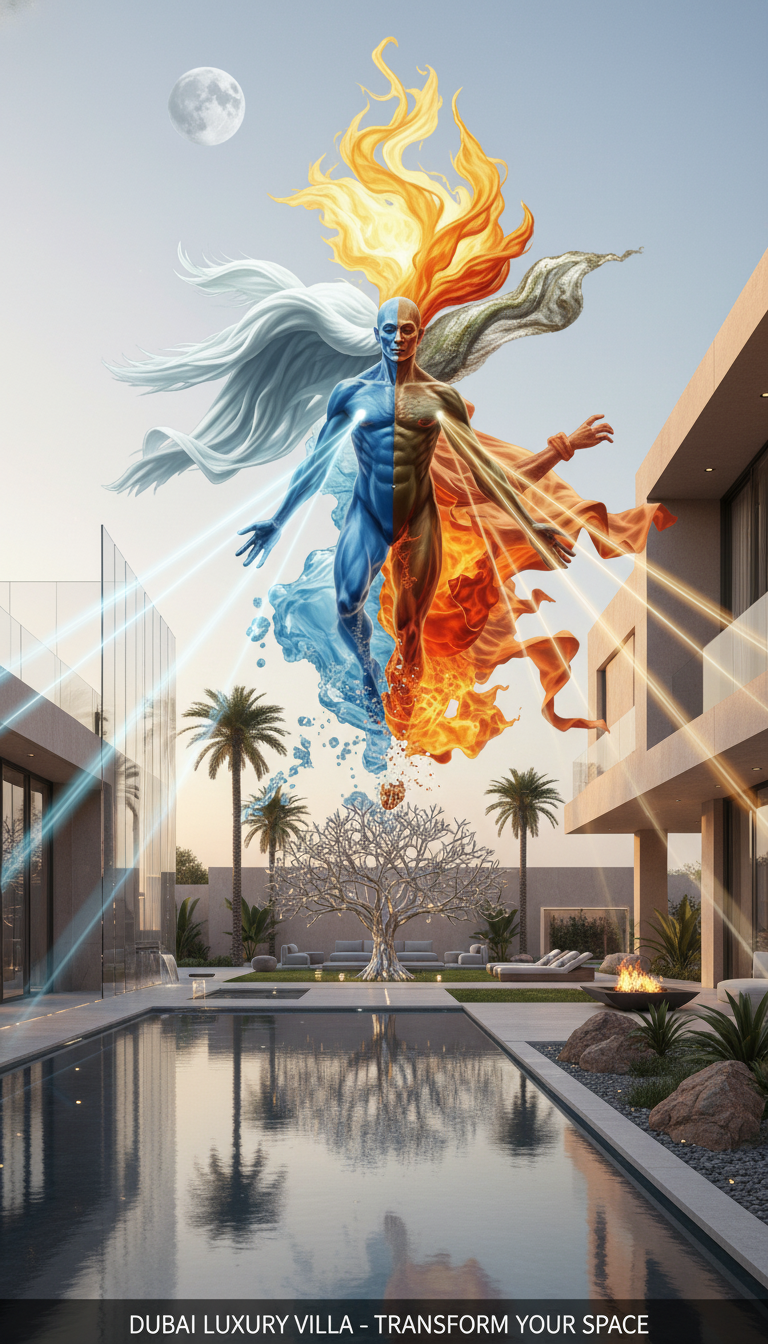 merge this picture with the 5 elements of landscape this entire theme is based on dubai try to match with dubai villa landscape as we are goiing to put as add show it like our charecter is getting in to the landscape and transforing in to design show the landscape as modern design show some light lays passing from each element of the charecter to the elements found in the landscape the light rays like form the fire it will light fire from water it will lit water from space from earth it will lit for earth form air it will lit air from green it will light plants make the human character as hollow transparent character and the make the 5 elements revolving around him like 5 elements of nature male charecter with out mare details of the face and body only cosmical representation architecture