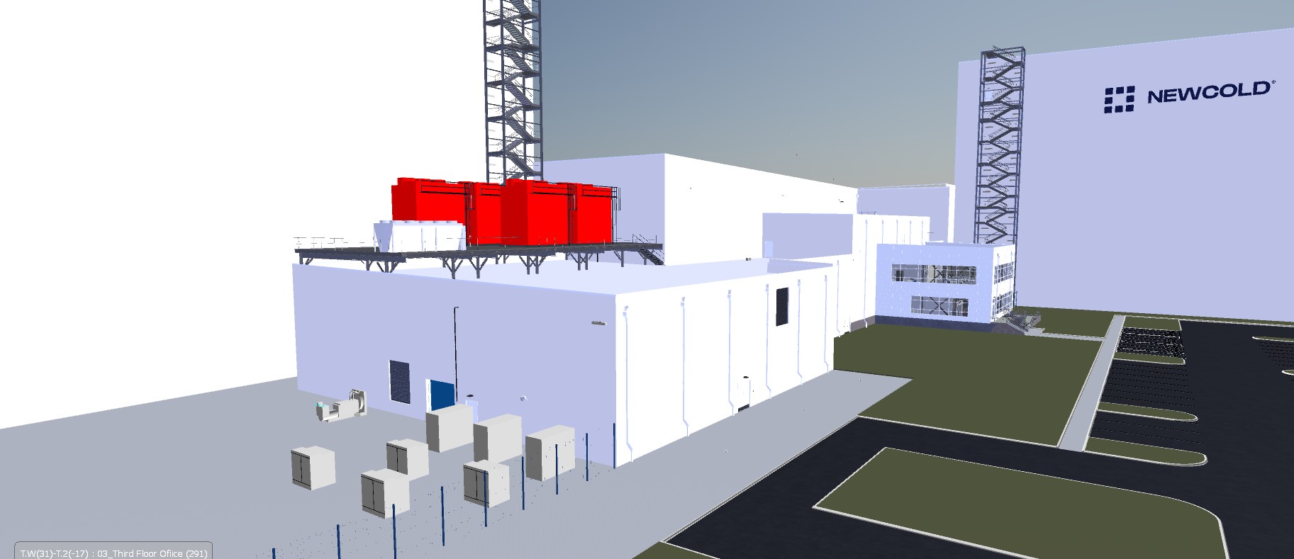 a modern industrial building with a sleek and minimalist design the main structure is composed of large white walls accented by light grey details the windows are expansive and transparent reflecting the clear blue sky above doors and loading bays are highlighted in deep blue metal stairs contrast in a darker grey adding an industrial touch the ground is a smooth dark asphalt complemented by vibrant orange safety barriers the atmosphere is clean bright and inviting under a clear sunny day with a serene cloudless sky