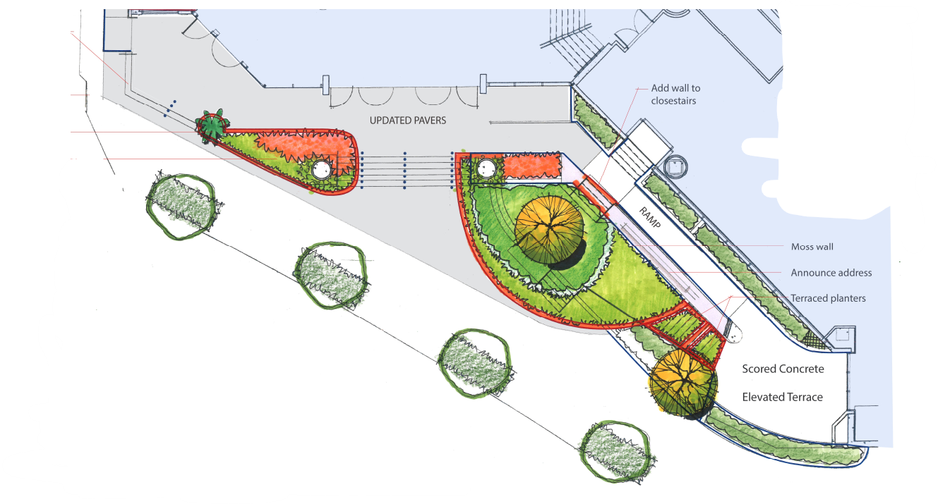 use this plan view sketch and create the landscape elevations the location is at 1101 wilson blvd in arlington va