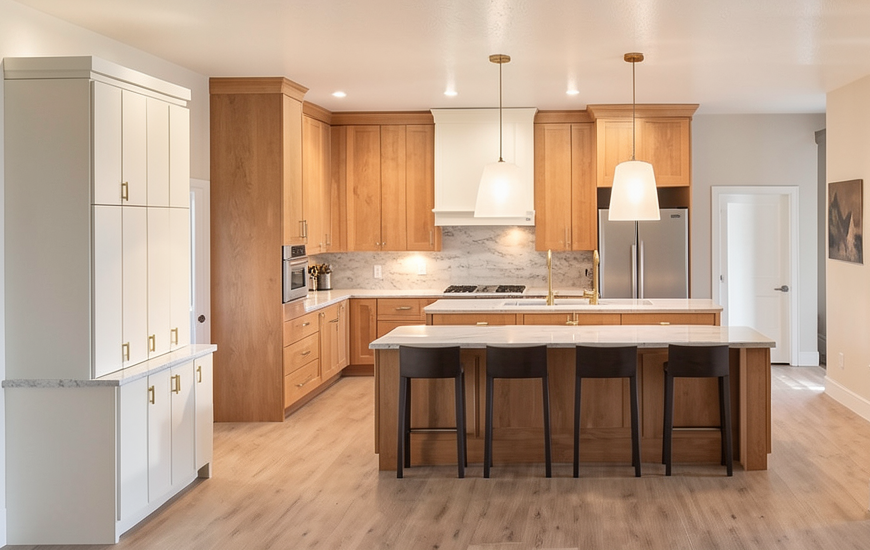 please lightly stage kitchen in a transitional style leave the cabinets countertops sinks and faucets the same remove the pendant lighting over the kitchen islands