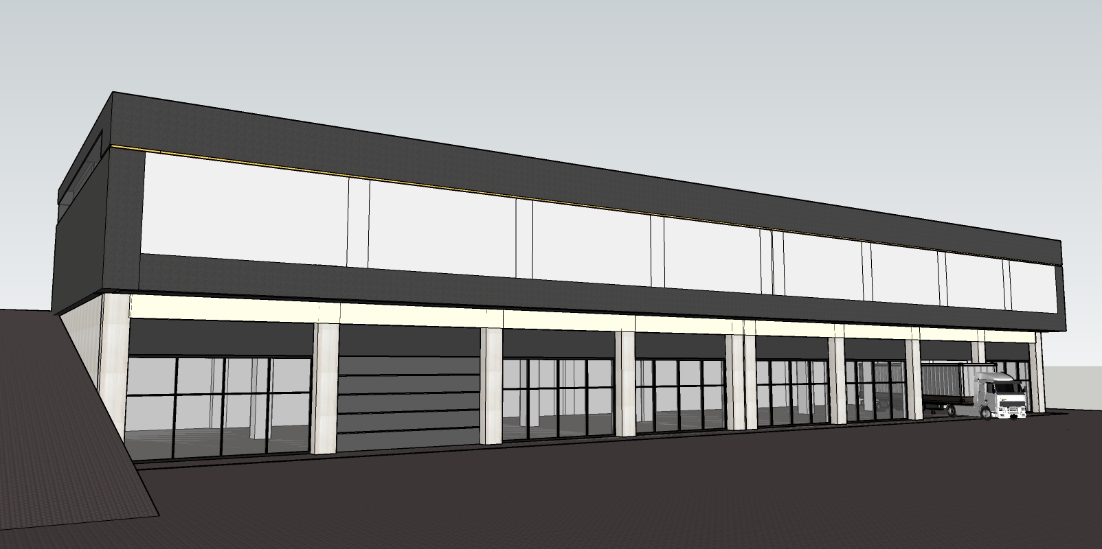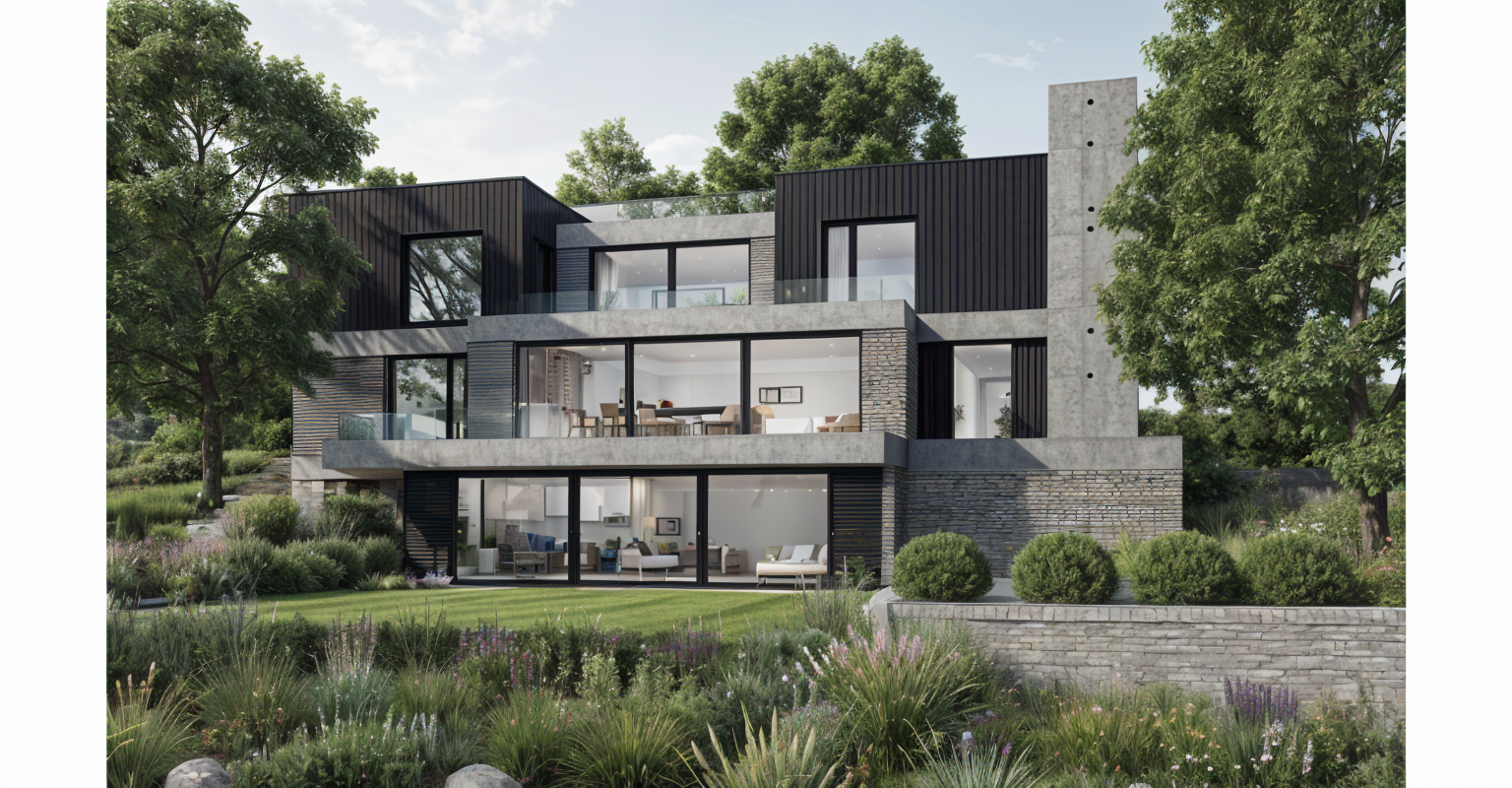 exterior shot dark grey plaster light beige plaster sun daylight with strognge shadows tree in corner of site architecture