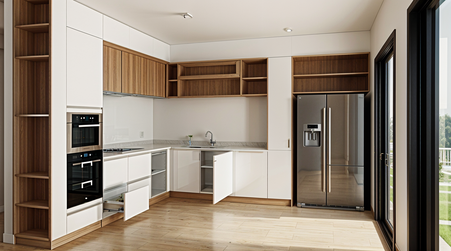 add led ligths below the wall cabinetsadd led light inside de top tall shelf and add a glass door on it add kitchen stuff on to counter top and shelves