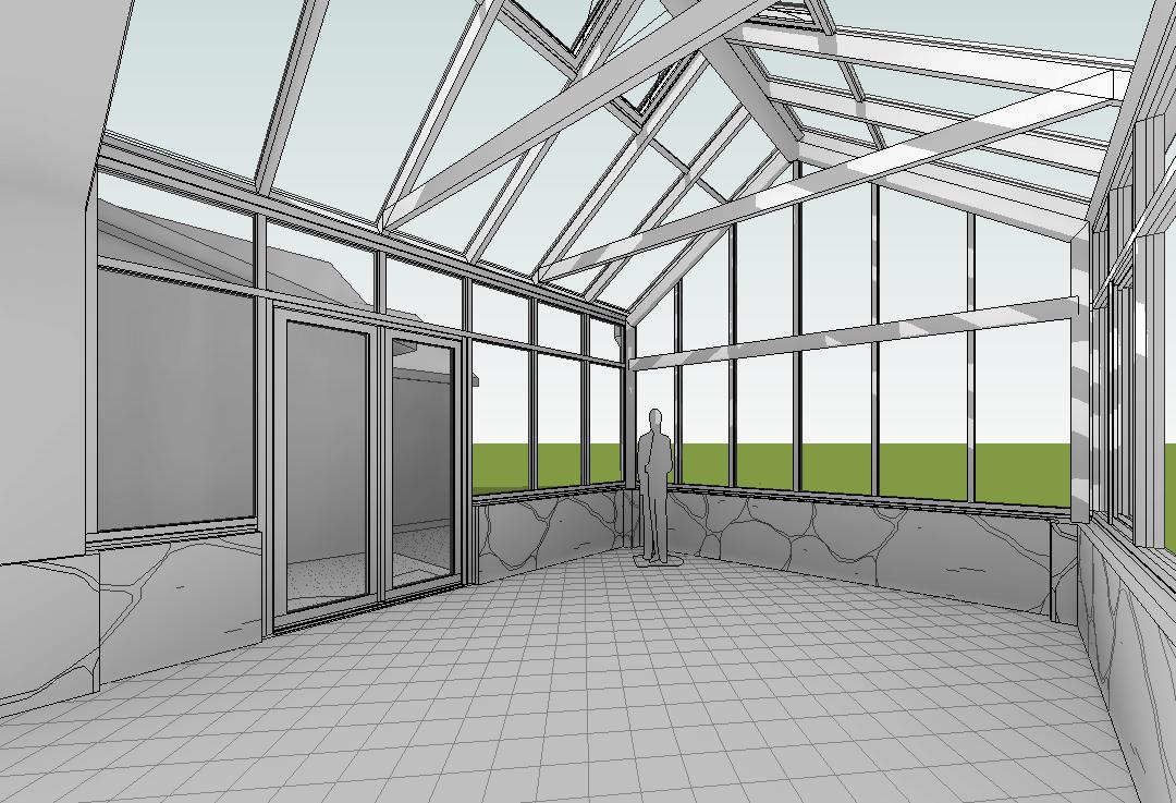 render a light filled conservatory with clear glass and black frames the floor is a slate tile and the walls are a rustic stone the room is filled with potted plants surrounding a coffee table and sofa arrangment